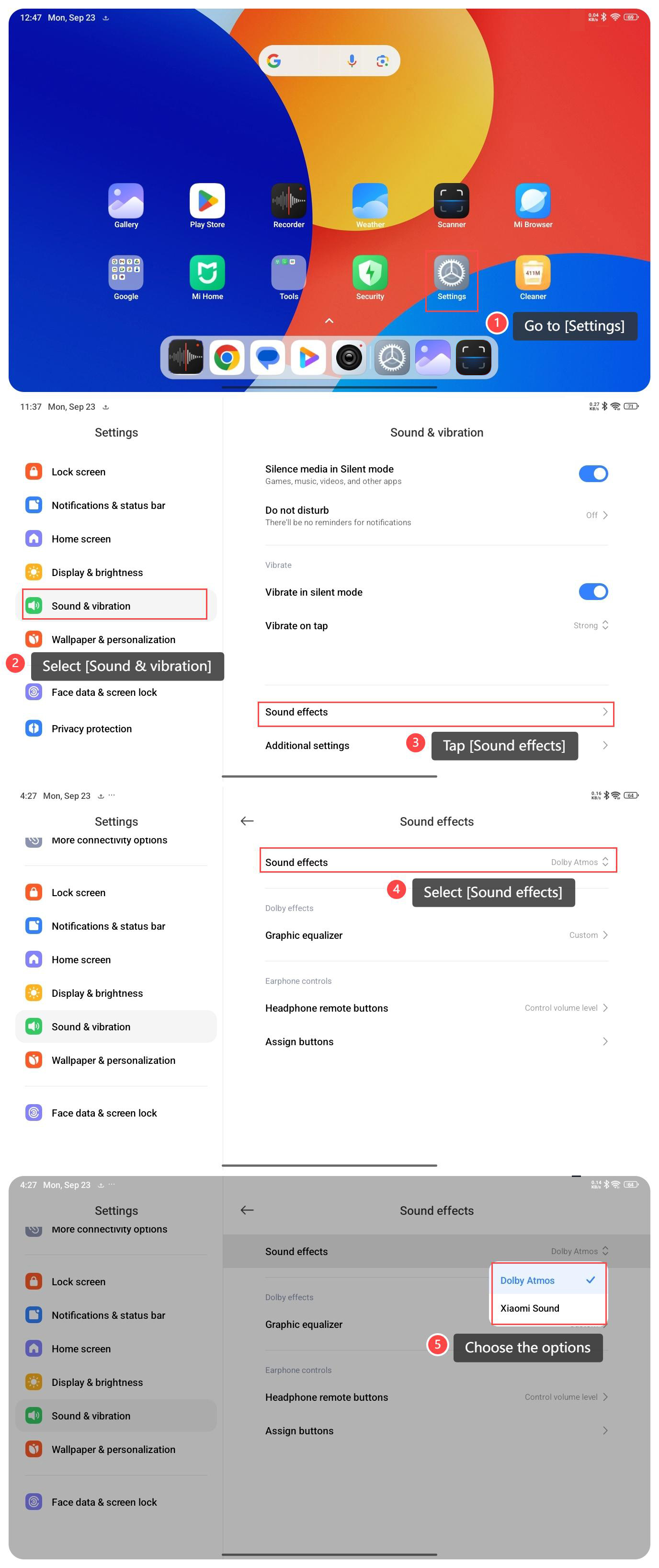 Setting up sound effects on the Redmi Pad SE 8.7 allows you to customize the audio output to suit your preferences or the type of media you are consuming. This feature provides you with flexibility in shaping your tablet’s audio characteristics for a more enjoyable listening experience. To set the sound effect on your tablet, please refer to the following steps: 1. Go to [Settings]; 2. Select [Sound & vibration]; 3. Tap [Sound effects]; 4. Select [Sound effects]; 5. Choose the options [Dolby Atmos] or [Xiaomi Sound] as you prefer. Note: 1. Monitor battery consumption, as some features will drain power. Also, be mindful of volume adjustments to avoid sudden loud sounds that could be jarring; 2. Consider your surroundings when adjusting sound effects, and be aware that not all effects may perform optimally due to the device's hardware capabilities.