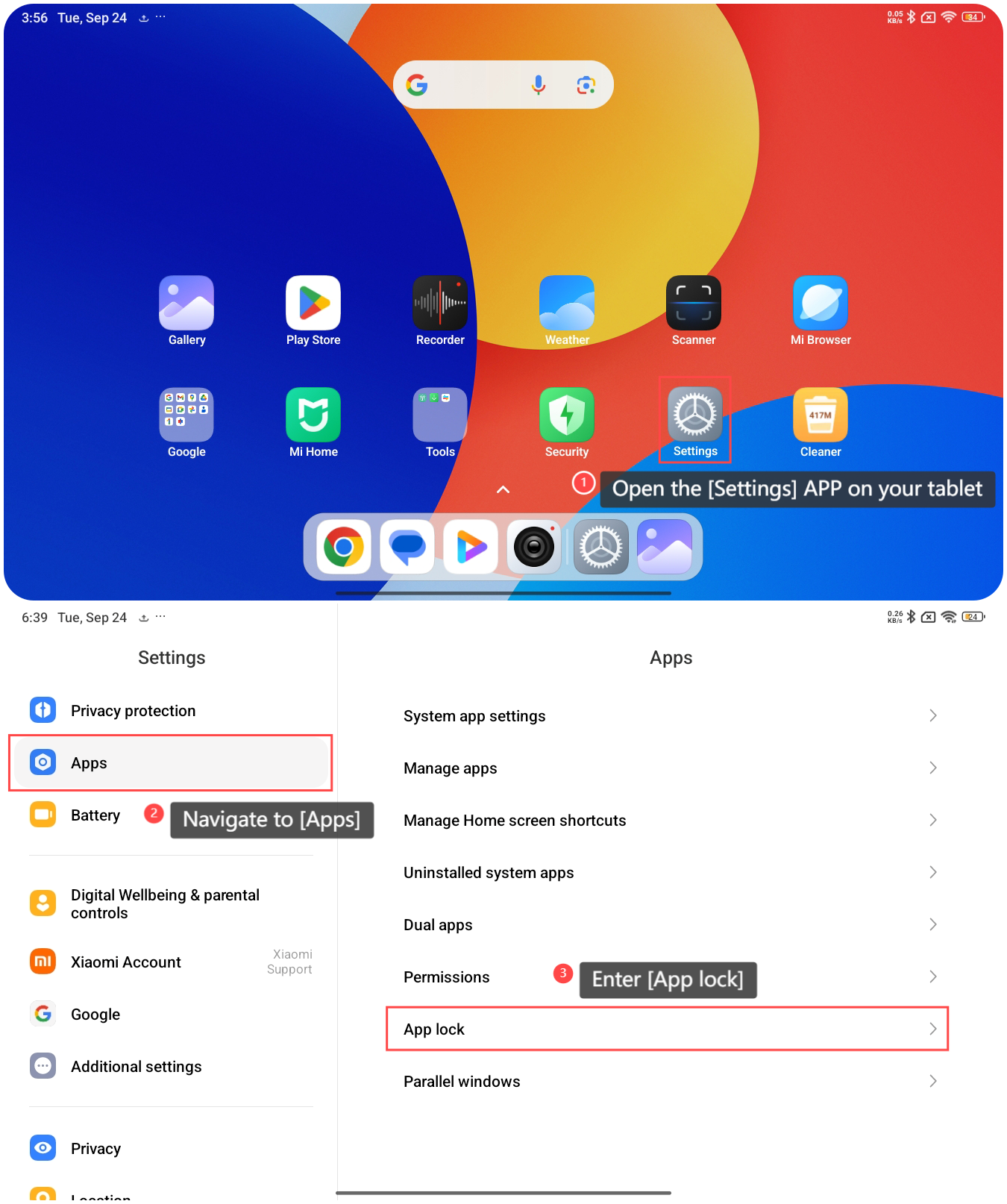 If you linked your Xiaomi Account when enabling App lock on the Redmi Pad SE 8.7, you can resolve the forgotten password issue through this method. However, if you did not link a Xiaomi Account, you will only be able to perform a factory reset. If you've forgotten the App lock password on the tablet, please refer to the following steps: 1. Open the [Settings] APP on your tablet; 2. Navigate to [Apps]; 3. Enter [App lock]; 4. Tap [Forgot password]; 5. If you have not added a Xiaomi Account, you can only reset your password after a factory data reset. Tap [Got it] to reset; 6. If you have added a Xiaomi Account, you just need to enter the password for the Xiaomi Account you added to reset the password.