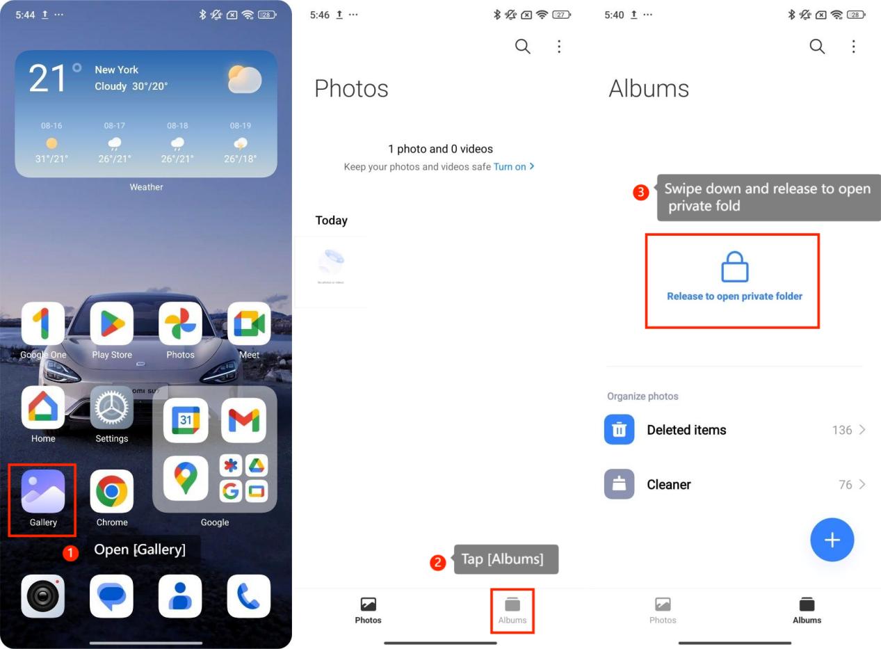 The private album of the Xiaomi smartphone provides you with a secure storage space for protecting the privacy of personal photos and videos. Through encryption, only you can access the content in the private album. This feature effectively prevents sensitive media files from being accidentally leaked or viewed by others, providing strong protection for your privacy and is an ideal choice for protecting personal information security. To use this feature, here are the methods for your reference: 1. Open [Gallery]; 2. Tap [Albums]; 3. Swipe down and release to open private fold. Then, enter privacy protection password to find the private pictures. Note: For the first time to use private album, you need to set up a password.