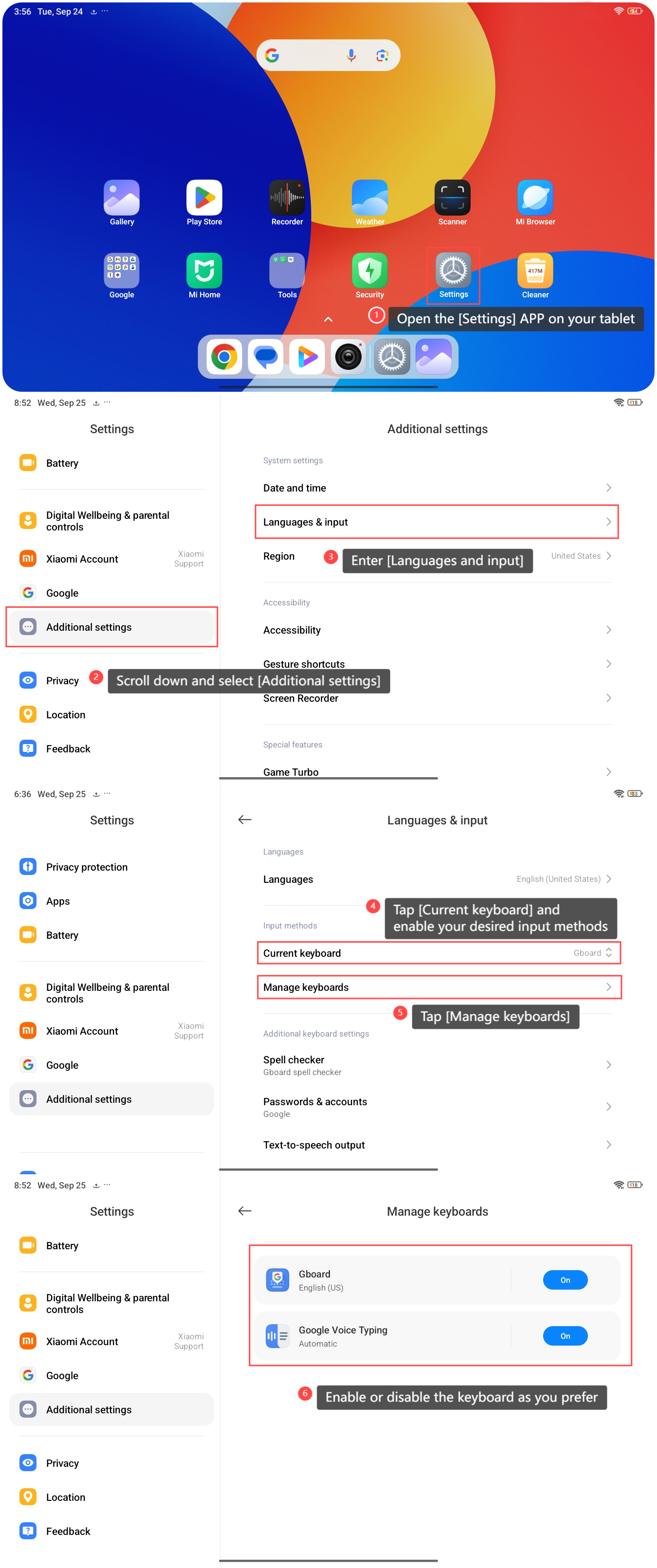 Setting and switching input methods on the Redmi Pad SE 8.7 allows for versatile typing experiences, accommodating multiple languages and preferences. This enhances productivity, making it easier to communicate and type in different contexts effectively. To set and switch an input method on the Redmi Pad SE 8.7, please refer to the following steps: 1. Open the [Settings] APP on your tablet; 2. Scroll down and select [Additional settings]; 3. Enter [Languages and input]; 4. Tap [Current keyboard] and enable your desired input methods; 5. Additionally, you can tap [Manage keyboards]; 6. Enable or disable the keyboard as you prefer. Note: Ensure the input method supports your preferred languages and is compatible with the APPs you use.