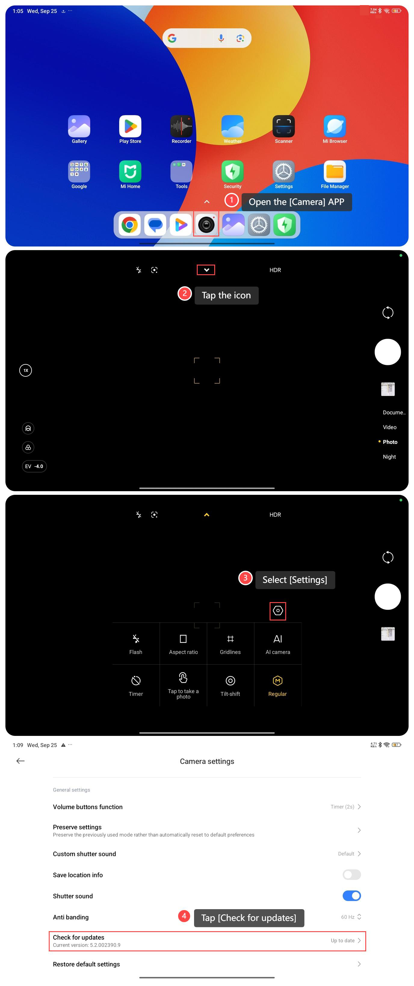Updating the camera on the Redmi Pad SE 8.7 involves installing software updates that can enhance the camera’s performance or add new features. To update the camera on your tablet, please refer to the following steps: 1. Open the[Camera]APP; 2. Tap the icon in the middle at the top; 3. Select [Settings]; 4. Tap [Check for updates]. Note: 1. Before updating, it is best to back up important photos and data to prevent problems during the update process; 2. Make sure to update in a stable Wi-Fi environment to avoid download interruptions; 3. During the update process, make sure the device has sufficient power to avoid update failures due to insufficient power; 4. Make sure the camera update is compatible with other software and applications on the device to avoid functional conflicts.