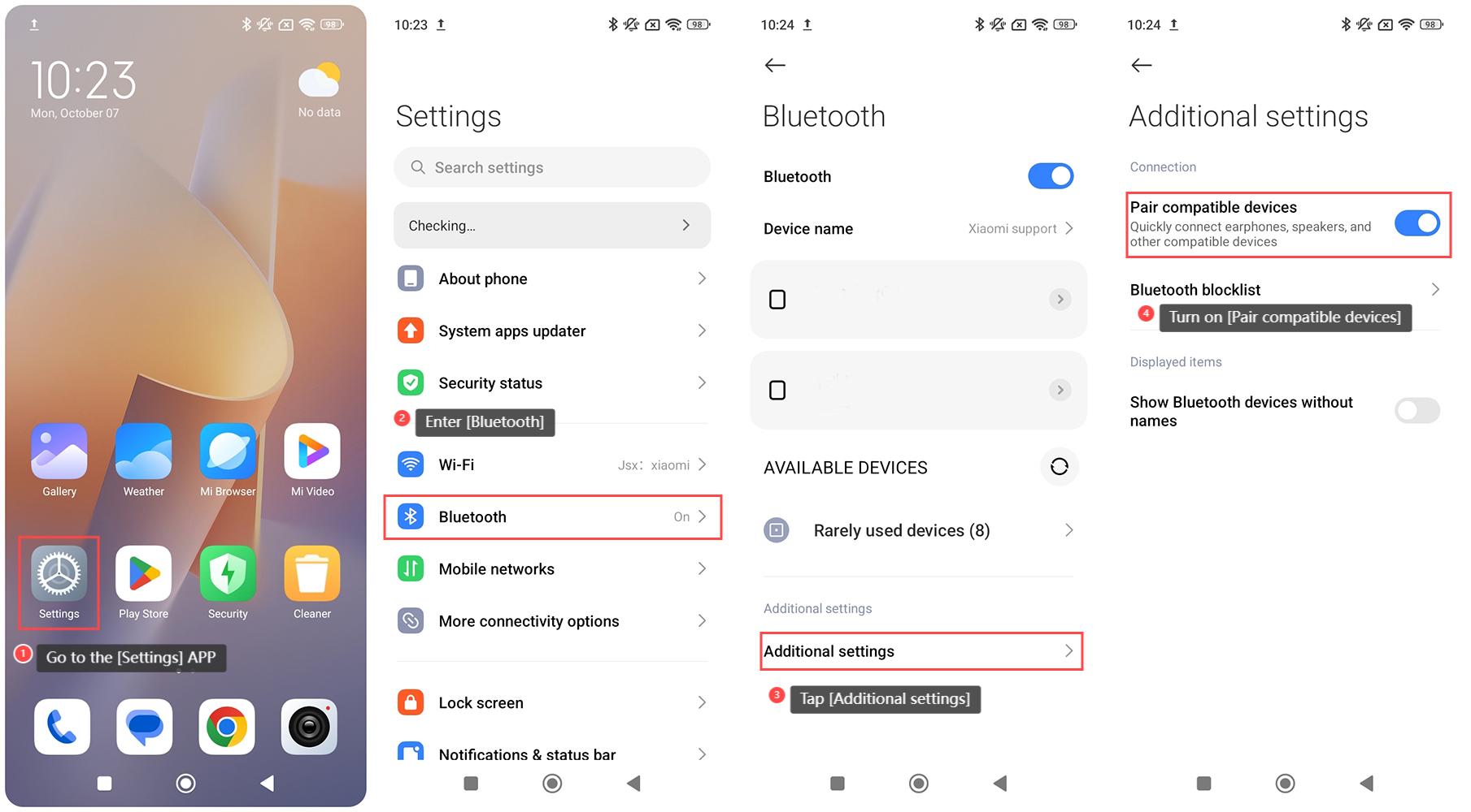 Quick pairing with Bluetooth devices allows the Redmi 13C 5G to connect quickly and effortlessly with other Bluetooth-enabled devices, ensuring a seamless and hassle-free experience when syncing with headphones, speakers, or other accessories for enhanced functionality and convenience. To quickly pair the Redmi 13C 5G to other Bluetooth devices, please refer to the following steps: 1. Go to the [Settings] APP on your phone; 2. Enter [Bluetooth]; 3. Tap [Additional settings]; 4. Turn on [Pair compatible devices] and then you can quickly connect earphones, speakers, and other compatible devices. Note: This function’s main purpose is to save time by eliminating the need for manual searches and entering pairing codes, making it easier to connect and use devices. For instance, headphones and speakers can quickly link to the phone for seamless audio experiences.