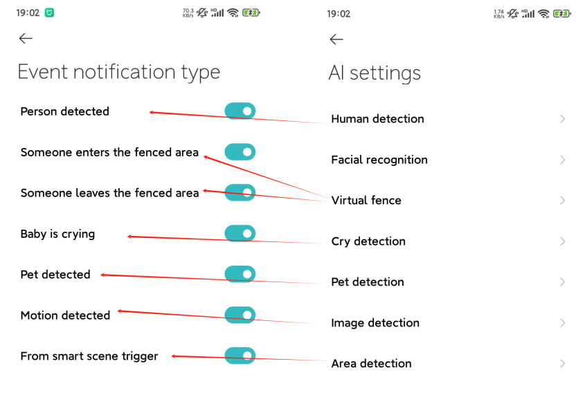 12. Q: How to configure Home surveillance on the Xiaomi Smart Camera C500 Dual? A: Go to the [Mi Home/Xiaomi Home] APP >> [Xiaomi Smart Camera C500 Dual] >> the three-dot icon >> [Home surveillance settings] >> enable or disable [Home surveillance] >> configure [Home surveillance time period], [Push notification intervals], [Detection push notifications] and [Event notification type]. Here are more details of configuring Home surveillance: 1. You need to enable the respective detected items in [AI settings], and when the trigger conditions are met, the function of Home surveillance will record event videos; 2. Home surveillance time period: You can configure all-day surveillance and periodical surveillance; 3. Sensitivity of area: You can select from high sensitivity and low sensitivity; 4. Push notification intervals: You can select the intervals from 3 minutes, 5 minutes, 10 minutes and 30 minutes(you can only select from the default intervals and cannot customize the intervals. The shortest interval is 3 minutes to avoid frequent push notifications); 5. Event notification type: You need to enable the items in [AI settings] initially. Besides, only the trigger conditions are met can the notification push. Event notification type includes [Person detected], [Someone enters the fenced area], [Someone leaves the fenced area], [Baby is crying], [Pet detected], [Motion detected] and [From smart scene trigger]. You will not receive notification when you disable the options below [Event notification type]. If you need to check the event, please go to Home surveillance; 6. There are no push notifications and event videos in Home surveillance if there is no respective detection items in [AI settings]; 7. The respective event notification type of the AI settings is listed below: Note: 1. When [Home surveillance] is enabled, 9-second videos will be recorded and saved in the Xiaomi Home Secure. Videos in Home surveillance will be covered in a cycle of 7 days; 2. Apart from Human detection, other detection types in [AI settings] are disabled by default and need to enable manually; 3. The videos in Home surveillance cannot be deleted in batches; 4. You can also use Home surveillance without using MicroSD card and the Xiaomi Home Secure.