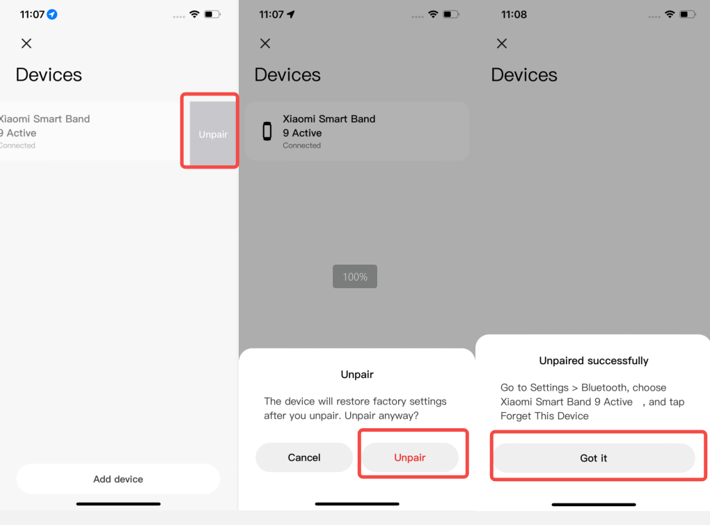 You can unbind the Xiaomi Smart Band 9 Active from the phone when you need to bind with a new wearable device. Unbinding and re-binding can also help resolve some connection problems when the band encounters issues such as failing to connect properly, frequent disconnections, or pairing failures. Method 1: 1. When the band and mobile phone are connected, open the Mi Fitness APP; 2. Go to[Device]; 3.Tap[Wearables]; 4. Swipe left to select [Unpair]; 5. Tap [Unpair] to unbind, and the band will be restored to factory settings after unbinding. Method 2: 1. When the band and mobile phone are connected, open the Mi Fitness APP; 2. Go to[Device]; 3. Scroll down to the bottom; 4. Select[Additional settings]; 5. Tap [Unpair]; 6. Tap [Unpair] again to unbind. After unbinding, the band will be restored to factory settings. Note: Before rebinding the same device next time in the Mi Fitness APP on iOS phones, you need to select the device in the system Bluetooth settings and tap [Forget This Device] first, as shown in the figure below, otherwise, the current device cannot be bound.