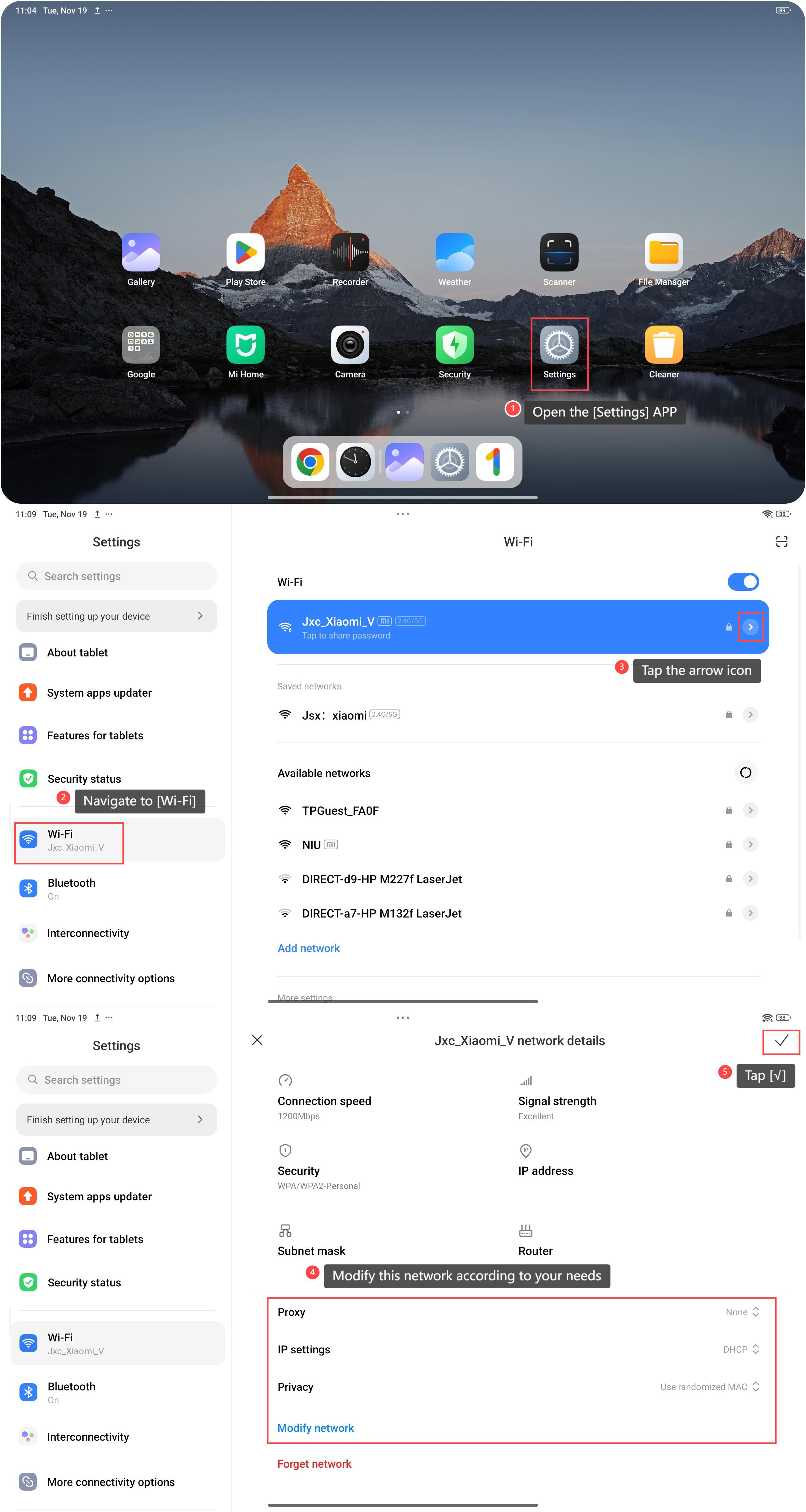 The Redmi Pad Pro supports modifying the Wi-Fi network, including Proxy, IP settings, Privacy, and password. Modifying the Wi-Fi network can enhance security and reduce the risk of unauthorized access by setting up restrictions, which will promote a more stable and faster connection. Besides, it allows you to manage connected Wi-Fi networks more effectively. To modify the Wi-Fi network on your tablet, please refer to the following steps: 1. Open the [Settings] APP on your device. You can find the gear icon on your home screen or in your APP drawer; 2. Navigate to [Wi-Fi] and tap it; 3. Tap the arrow icon on the Wi-Fi network that you connect; 4. Swipe down and modify this network according to your needs; 5. Tap [√] toconfirm.