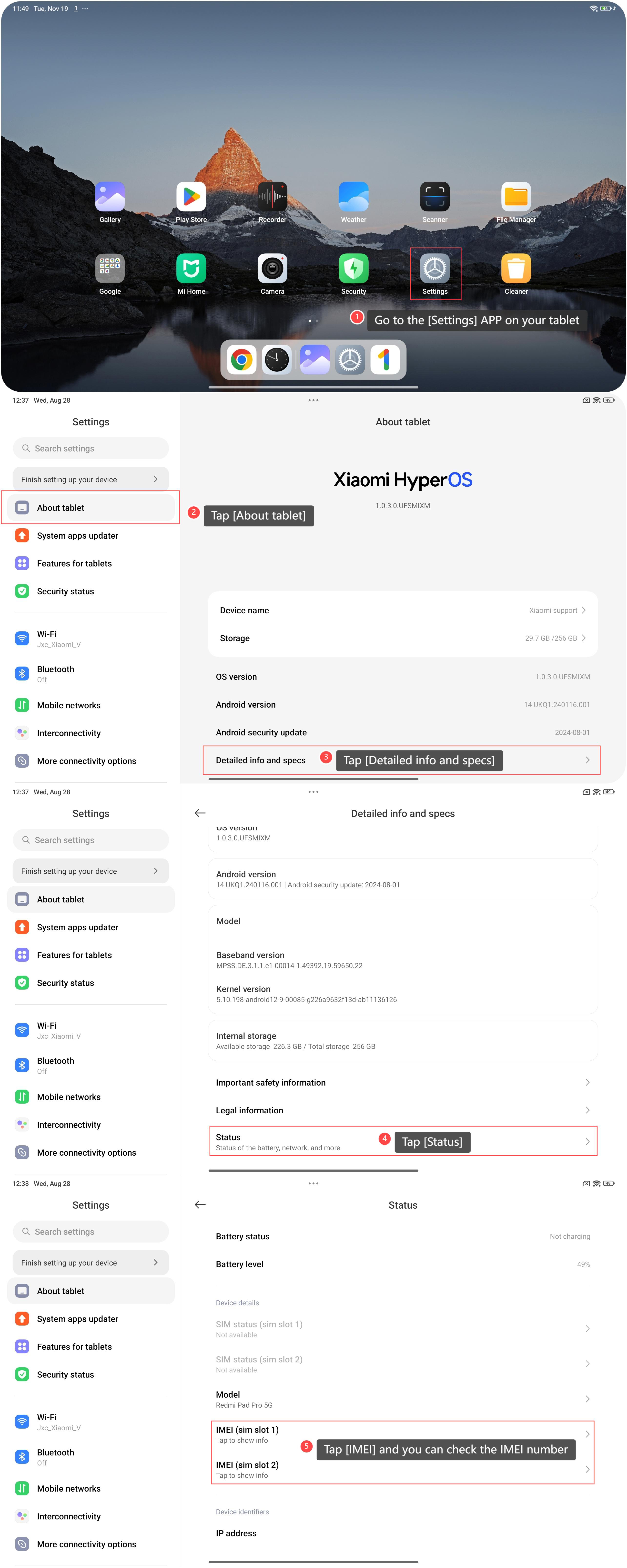 To check IMEI on the Redmi Pad Pro 5G, please refer to the following steps: