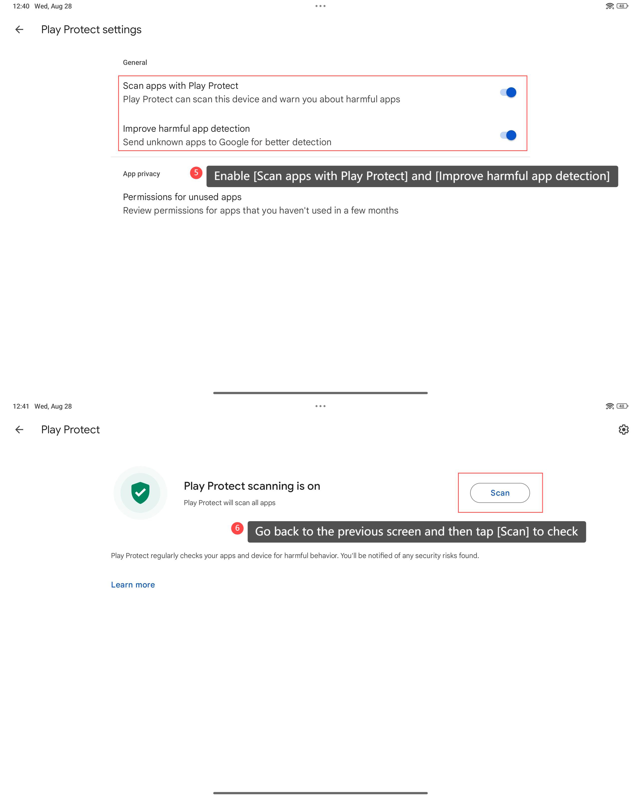 5. Enable [Scan apps with Play Protect] and [Improve harmful app detection];