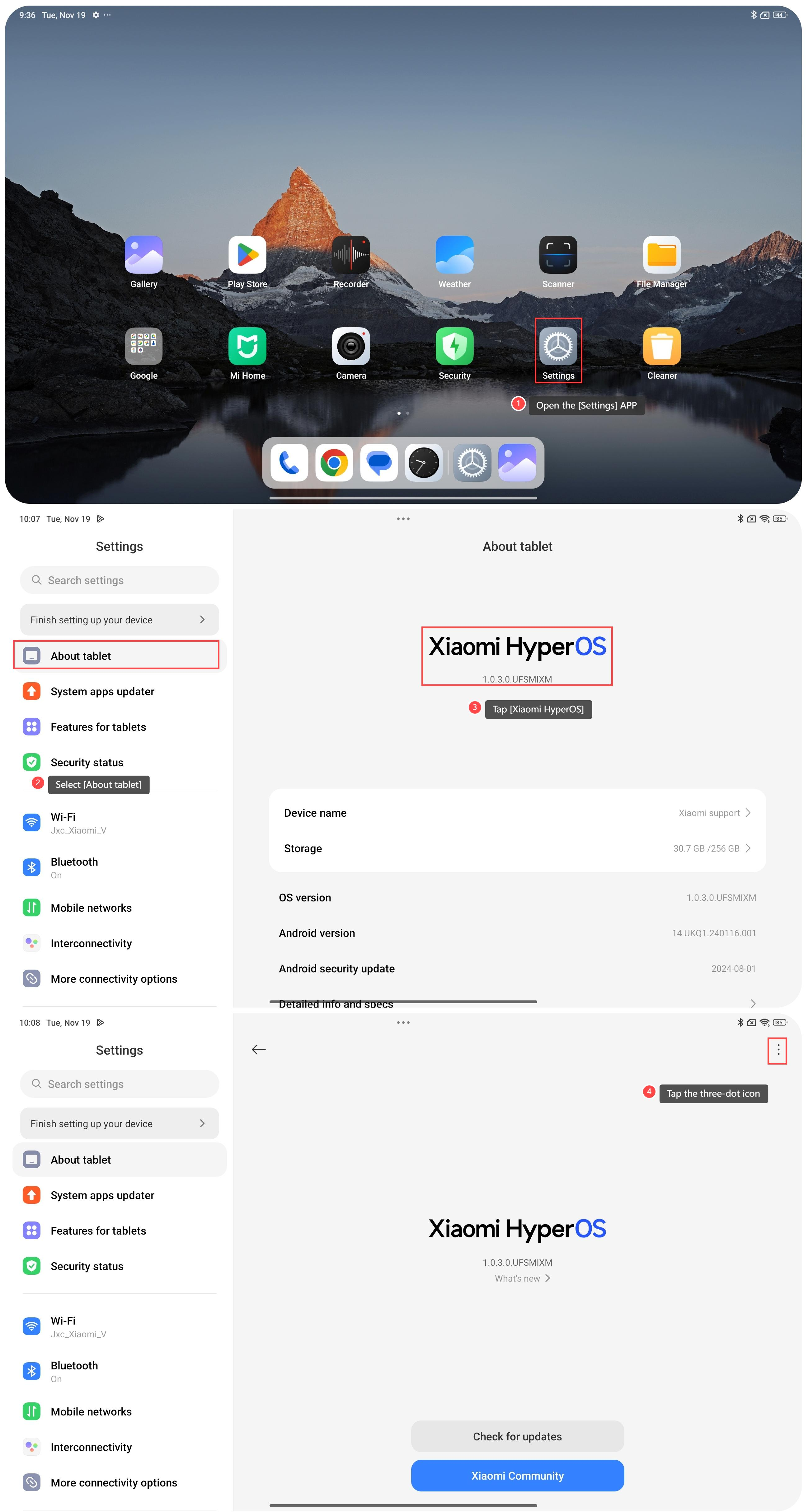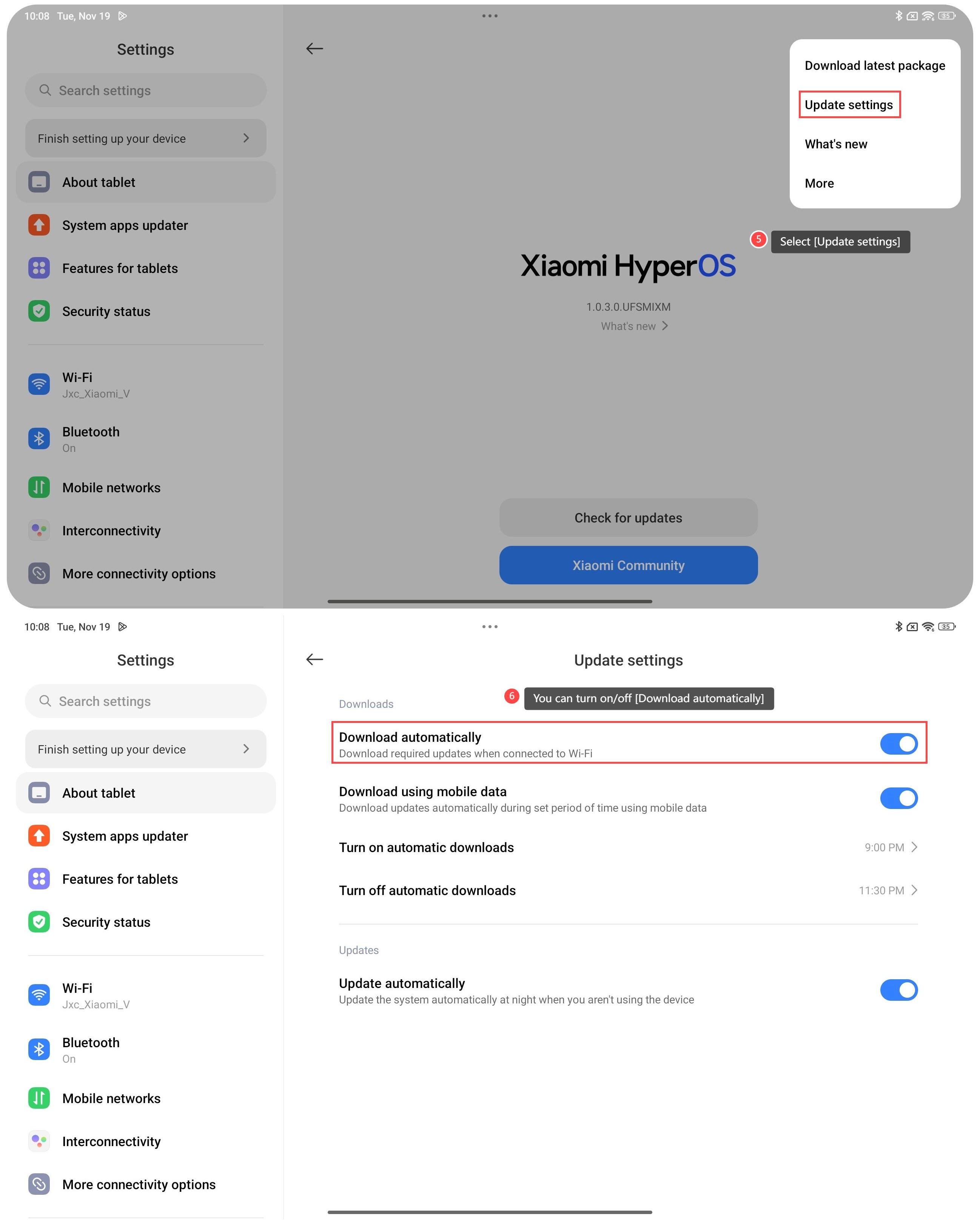 When the Download automatically feature is enabled on the Redmi Pad Pro 5G, it will check for new system versions and download them automatically in the background when the device is connected to Wi-Fi. To turn on/off Download automatically on your device, please refer to the following steps: 1. Open the [Settings] APP on your tablet; 2.Select [About tablet]; 3. Tap [Xiaomi HyperOS]; 4. Tap the three-dot icon at the upper right corner; 5. Select [Update settings]; 6. You can turn on/off [Download automatically]. Note: 1. Ensure your tablet is connected to a stable Wi-Fi network. This ensures a stable and faster download of updates; 2. Make sure your tablet has a sufficient battery level before initiating the update. It’s recommended to have at least 50% battery during the update process; 3. Regularly check the available storage space on your tablet. Download automatically can fill up your tablet’s storage over time. Ensure that you have enough space for updates and new content.