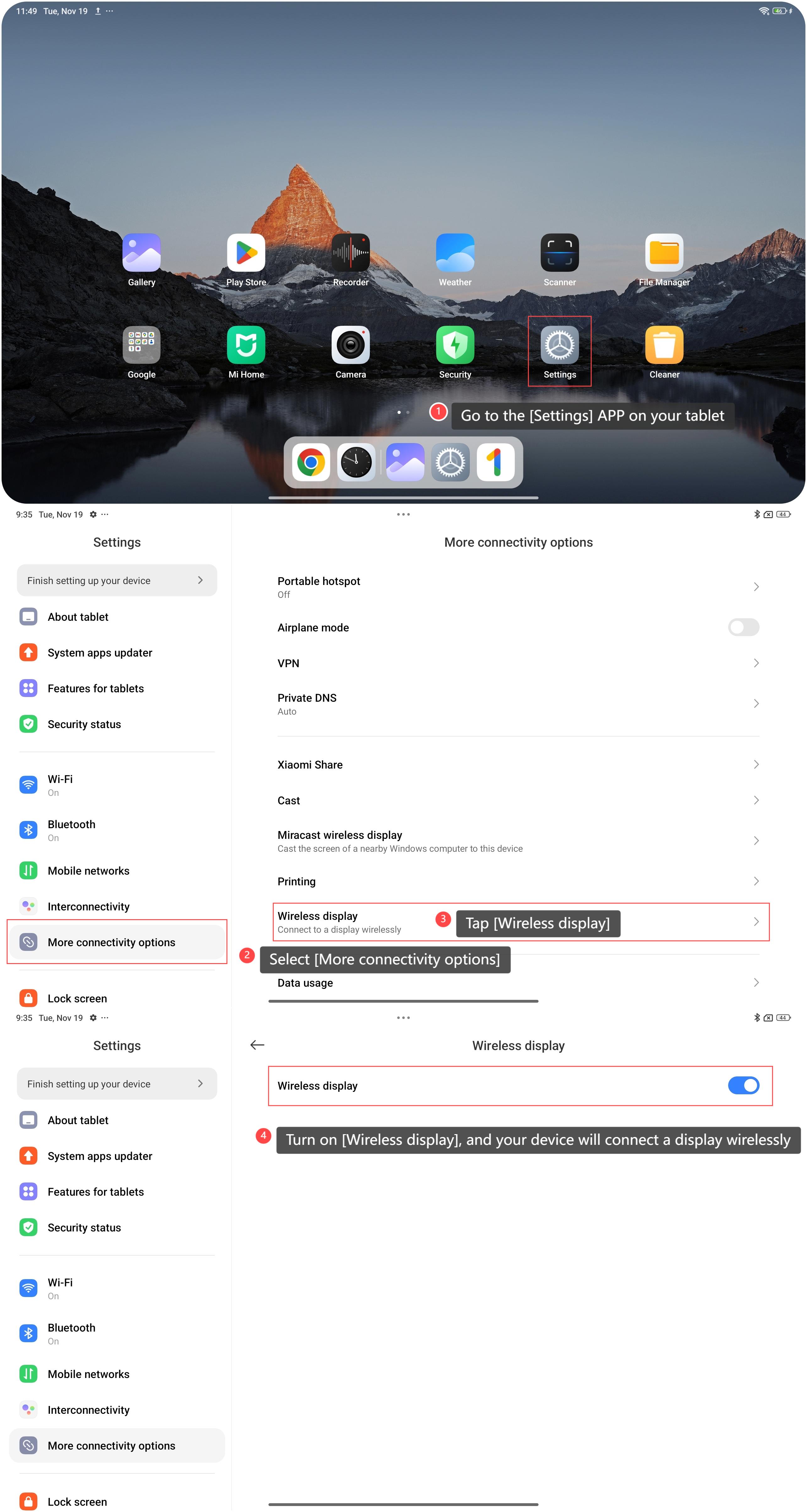 4. Turn on [Wireless display], and your device will connect a display wirelessly.