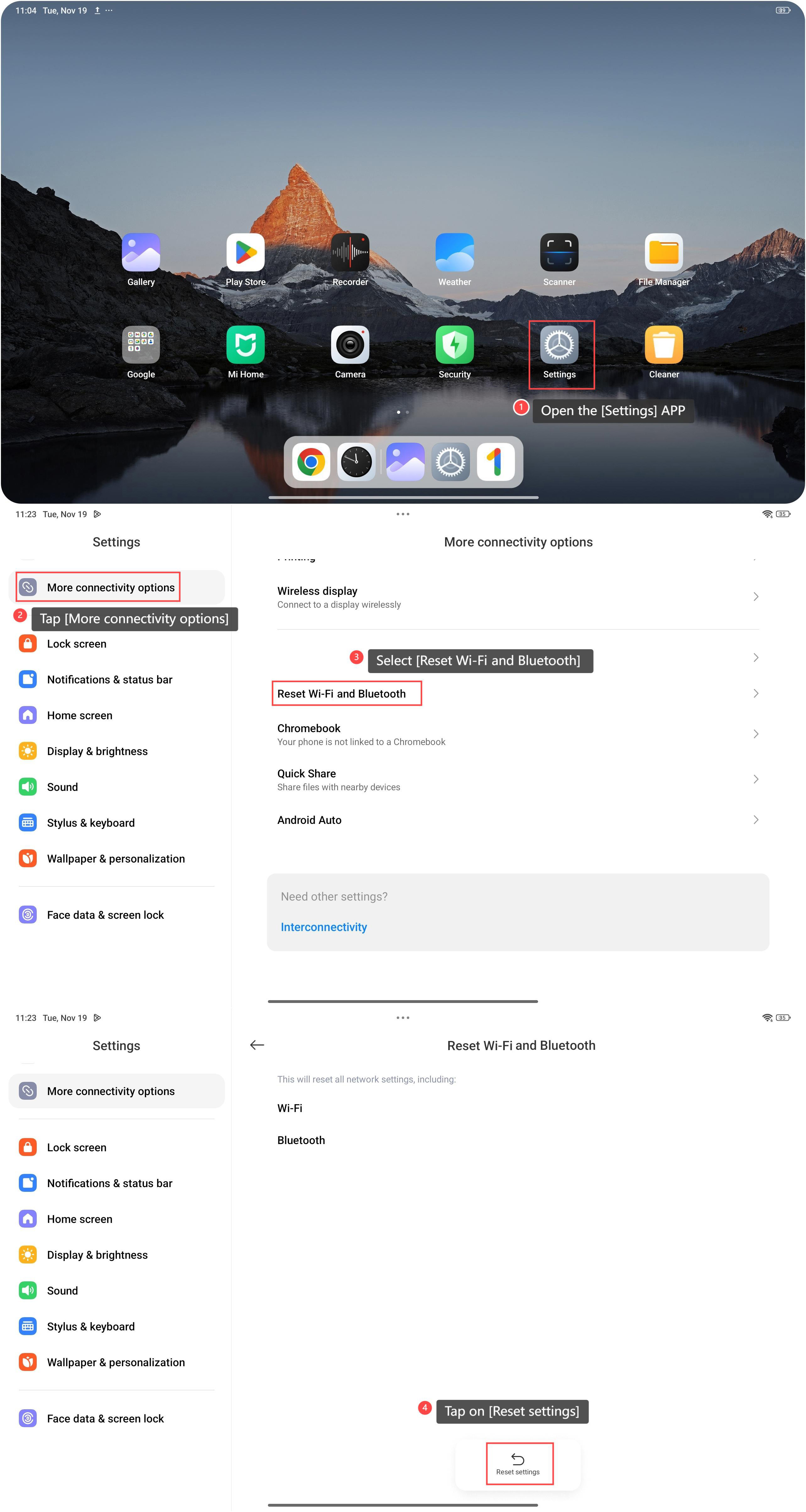 TheRedmi Pad Profeatures resetting Wi-Fi and Bluetooth, which will restore all wireless connections to the factory settings. This feature is a useful method to troubleshoot and refresh any wireless connecting configurations, helping to address connectivity problems and ensure a clean state for establishing new connections. To reset Wi-Fi and Bluetooth, please refer to the following steps: 1.Open the [Settings] APP on your tablet; 2.Tap [More connectivity options]; 3.Select [Reset Wi-Fi and Bluetooth]; 4. Tap on [Reset settings]. Friendly tip: Resetting network settings will clear all network-related configurations, including Wi-Fi and Bluetooth settings. It's advisable to back up important data. Having a backup ensures you can restore any critical information if needed.