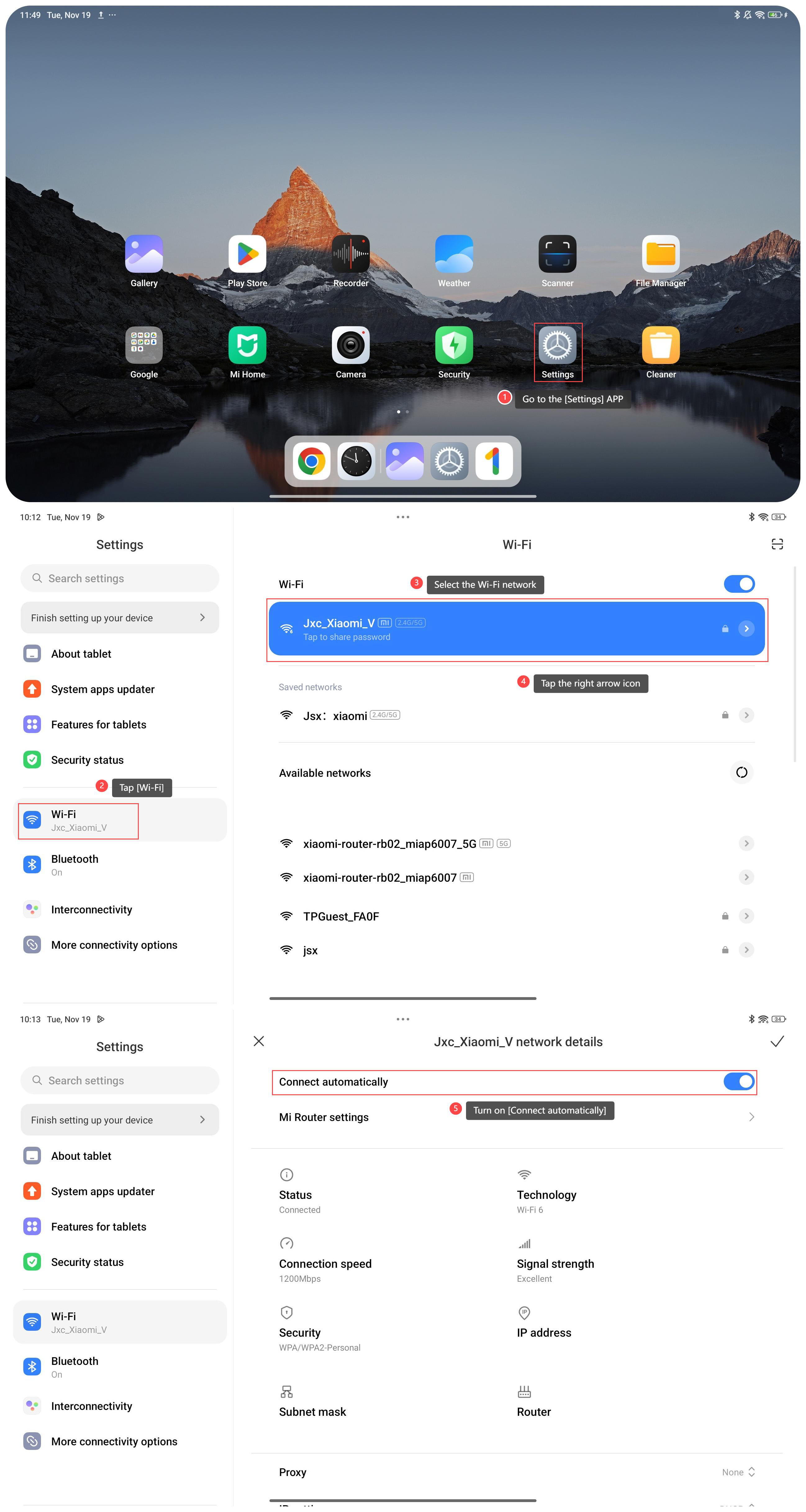 Enabling the Connect automatically feature for a Wi-Fi network on the Redmi Pad Pro allows your tablet to automatically connect to that network whenever it’s within range and available. To turn on Connect automatically on your tablet, please refer to the following steps: 1. Go to the [Settings]APPon your tablet; 2. Tap [Wi-Fi]; 3.Select the Wi-Fi network you are using; 4. Tap the right arrow icon; 5. On this page, turn on [Connect automatically]. Note: This is particularly useful for networks that you use regularly, such as the Wi-Fi in your home or workplace. It not only eliminates the need to manually select and connect to the network each time, but also ensures a seamless and convenient internet connection.