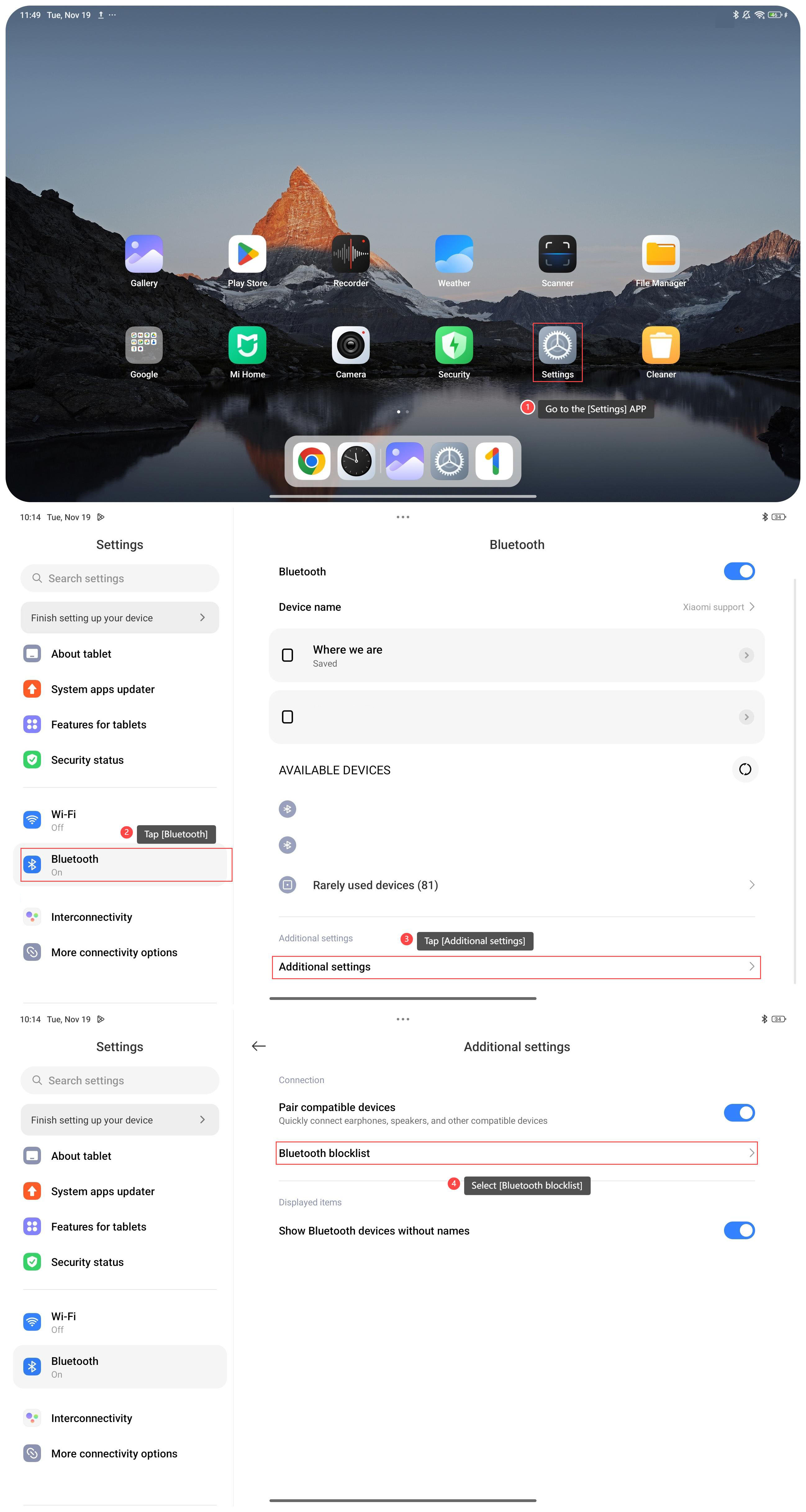 The Redmi Pad Pro supports blocking Bluetooth devices, which can prevent unauthorized access and protect sensitive data. Fewer active connections can bring better overall performance and stability for your Bluetooth functions. Blocking Bluetooth devices can also ensure that only trusted devices can connect, improving overall performance and reducing interference. To check which Bluetooth device has been blocked on your device, please refer to the following steps: 1. Go to the [Settings] APP on your tablet; 2. Tap [Bluetooth]; 3. Swipe down to find and tap [Additional settings]; 4. Select [Bluetooth blocklist] to check the blocked Bluetooth devices.