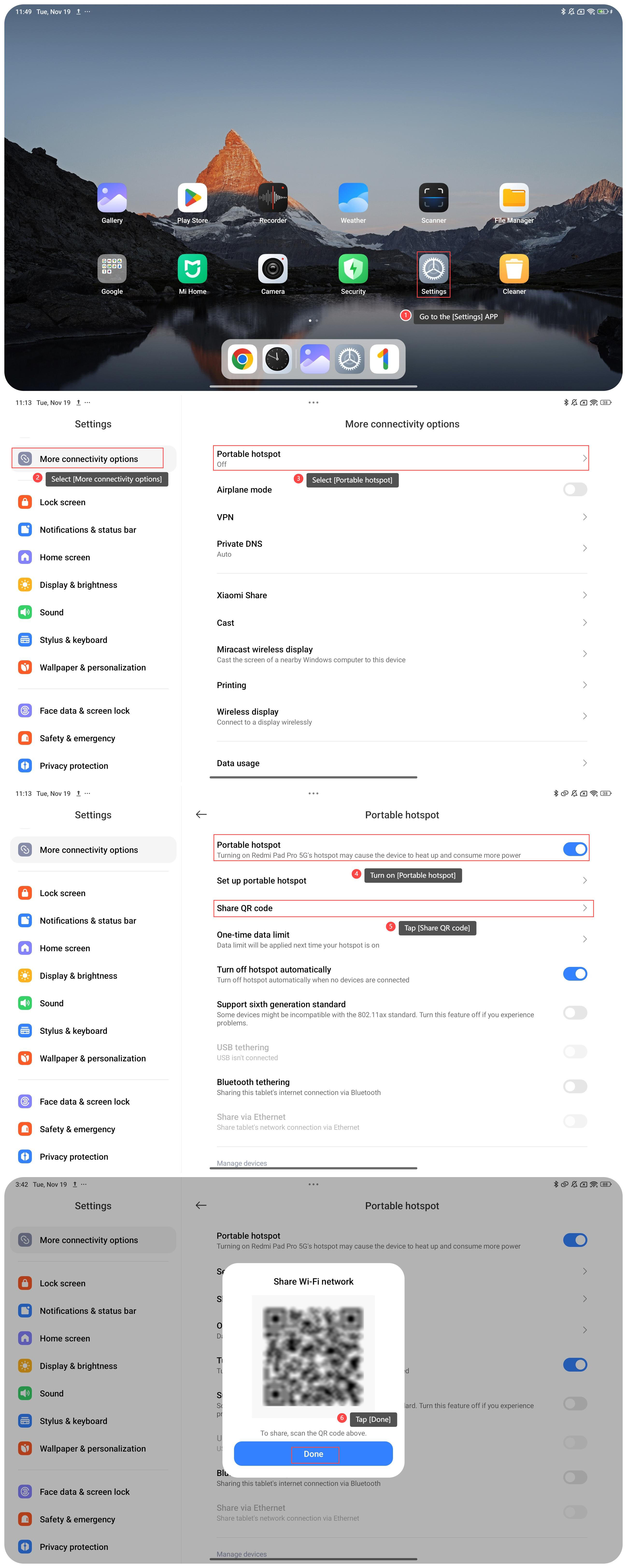 The Redmi Pad Pro 5G supports the built-in feature of enabling a portable hotspot thatallows you to turn your tablet into a mobile Wi-Fi hotspot, enabling other devices to connect to the internet. Aimed to bring your convenience and improve your using experience, you can select to share the hotspot QR code to help other devices connect to the network quickly without manually searching the Wi-Fi and entering the password. To share the hotspot QR code on your device, please refer to the following steps: 1. Go to the [Settings]APPon your tablet; 2. Scroll down and select [More connectivity options]; 3. Select [Portable hotspot]; 4. Turn on [Portable hotspot]; 5. Tap [Share QR code]; 6. Then the other device can scan the hotspot QR code of your device and tap [Done].