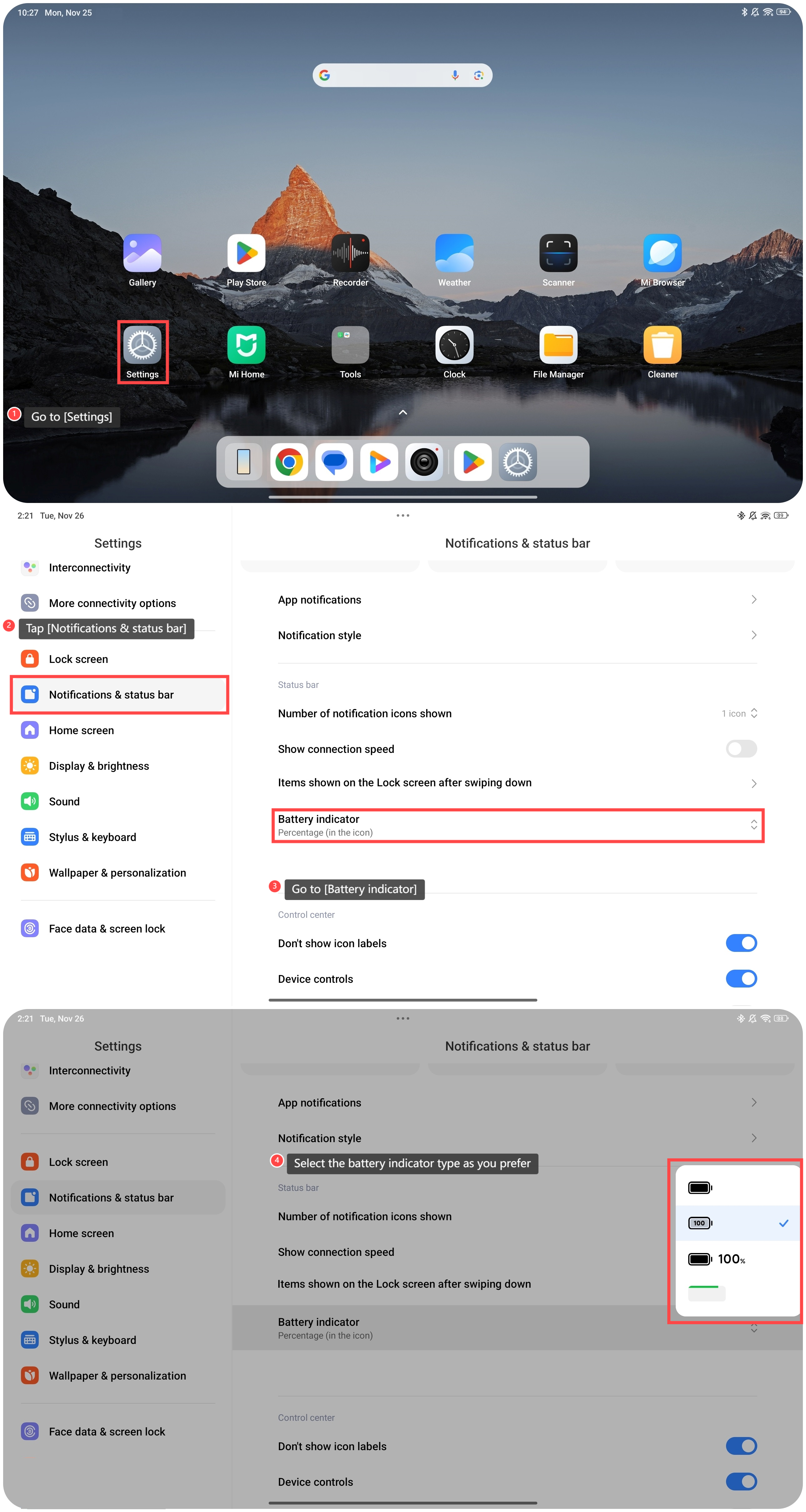 The battery indicator on the Redmi Pad Pro allows you to see your tablet’s remaining charge level and the charging status at a glance. You can adjust the battery indicator type as you prefer. Besides the battery indicator will show various colors and symbols to convey important information. Such as if the battery is low, the battery icon turns red. By providing this real-time feedback, the battery indicator helps you decide when to charge your tablet and you can plan your use of the tablet accordingly. To adjust the battery indicator type on the Redmi Pad Pro, please refer to the following steps: 1. Go to [Settings]; 2. Tap [Notifications & status bar]; 3. Go to [Battery indicator]; 4. Select the battery indicator type as you prefer.