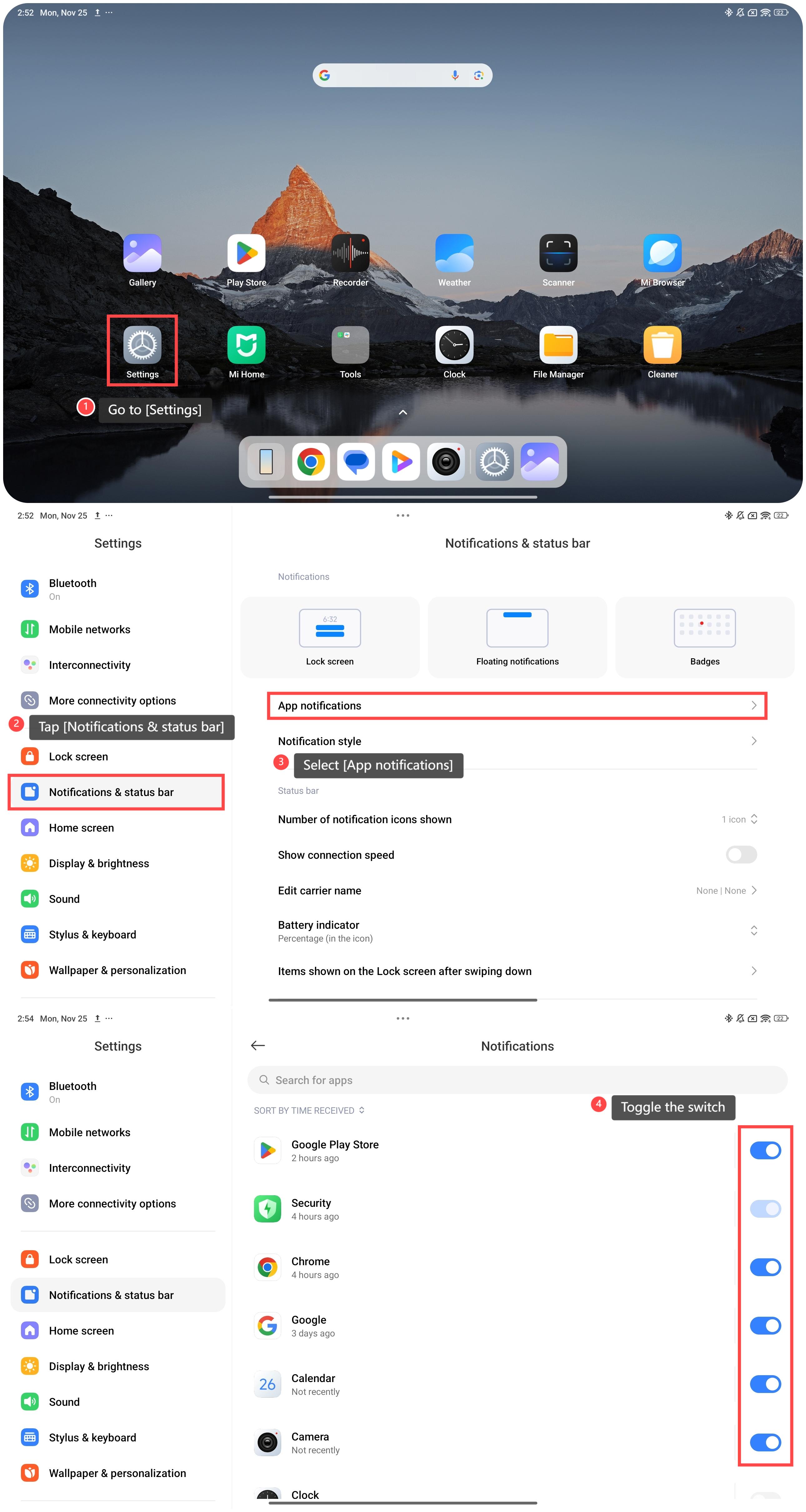 APP notifications on the Redmi Pad Pro 5Gare alerts generated by installed apps to inform you about updates, reminders, or actions that require your attention.They appear in the notification shade, lock screen, or as banners depending on your settings,allowing you to stay connected and informed. To manage APP notifications on your tablet, please refer to the following steps: 1. Go to [Settings]; 2. Scroll down and tap[Notifications & status bar]; 3. Select [App notifications] and you will see a list of APPs that are sorted by time received; 4. Look for the APP for which you want to manage notifications and toggle the switch next to the specific APP according to your preference. Note: You can set priority for important application or events, such as messages or calendar alerts, and disable notifications for less urgent apps.