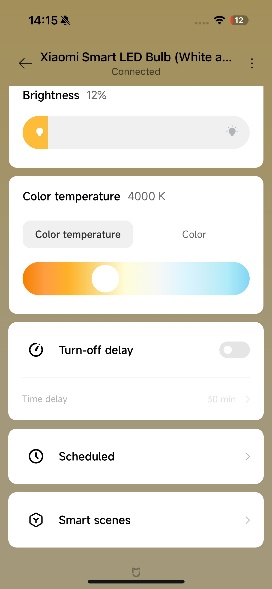7. Q: Can the Mi Home APP control the Xiaomi Smart LED Bulb (White and Color)? A: Yes. After the successful connection, the page will display as follows: