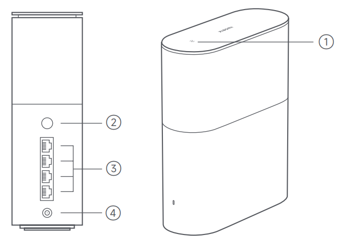 The appearance and accessories of the Xiaomi Mesh System BE3600 Pro are as follows: 1. NFC area: Simply touch the NFC area of your phone to the top of the router to quickly connect to Wi-Fi. To use this feature, enable the NFC function on your Android phone, and keep your phone unlocked; 2. Mesh/Reset button: Press the button to have Mesh networking with routers that support the Xiaomi Mesh function. Press and hold the button for 5 seconds to restore the router to its factory settings; 3. Network port: 4 WAN/LAN auto-sensing ports (1×2.5Gbps+3×1Gbps); 4. Power port: Connect the power adapter to the router. Note: Illustrations of the product and accessories are for reference purposes only. Actual product and functions can vary due to product enhancements.