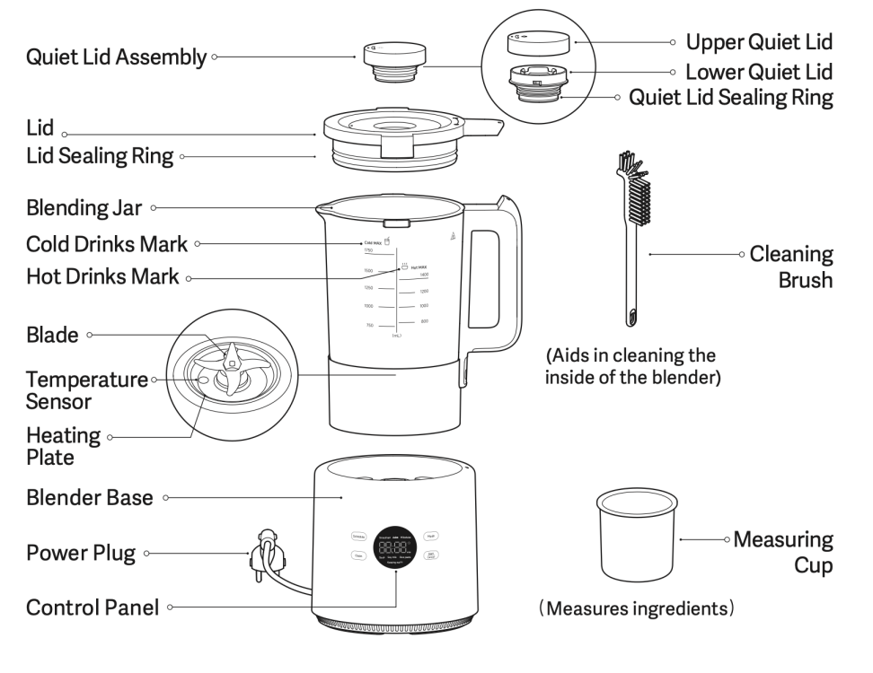 The product has a Blending Jar, with Cold Drinks Mark and Hot Drinks Mark. In the inner of the blending Jar, there are a Blade, Temperature Sensor and Heating Plate. It also comes with a blender base, which has a control panel on it. The product also has a Power Plug, a Cleaning Brush and a Measuring Cup.