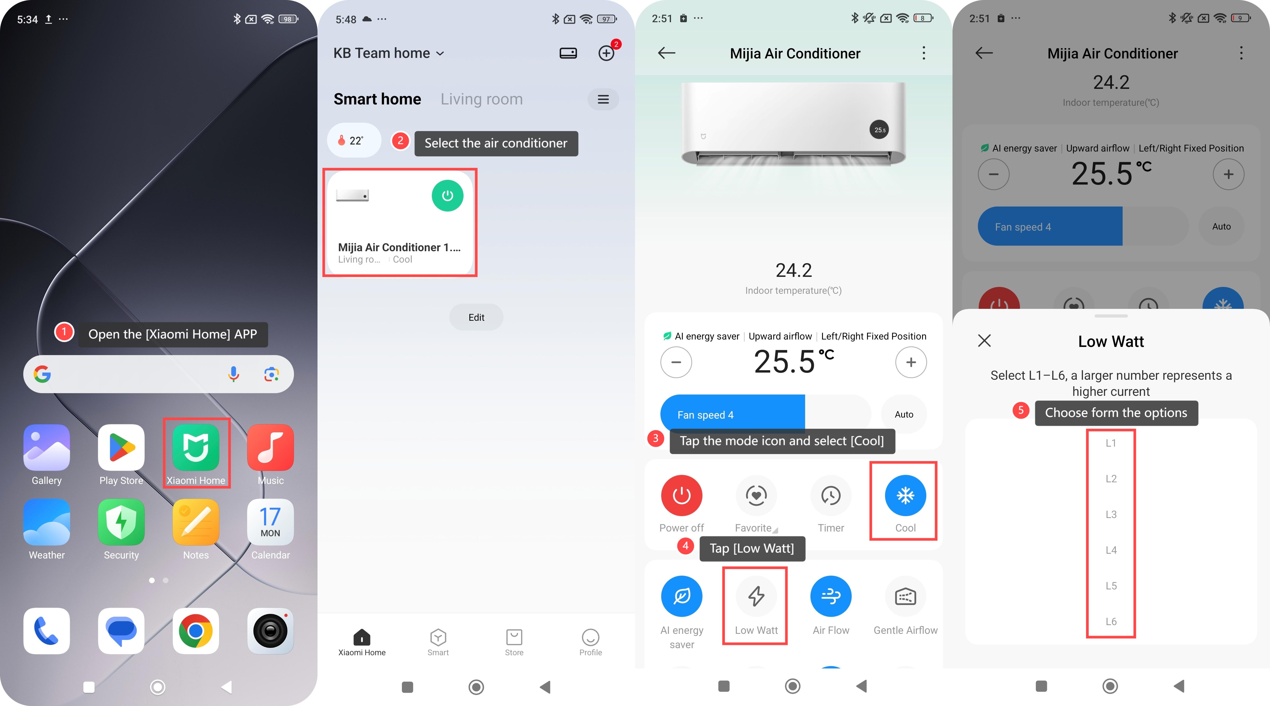 To use the LOW WATT function on the air conditioner, please refer to the following steps: