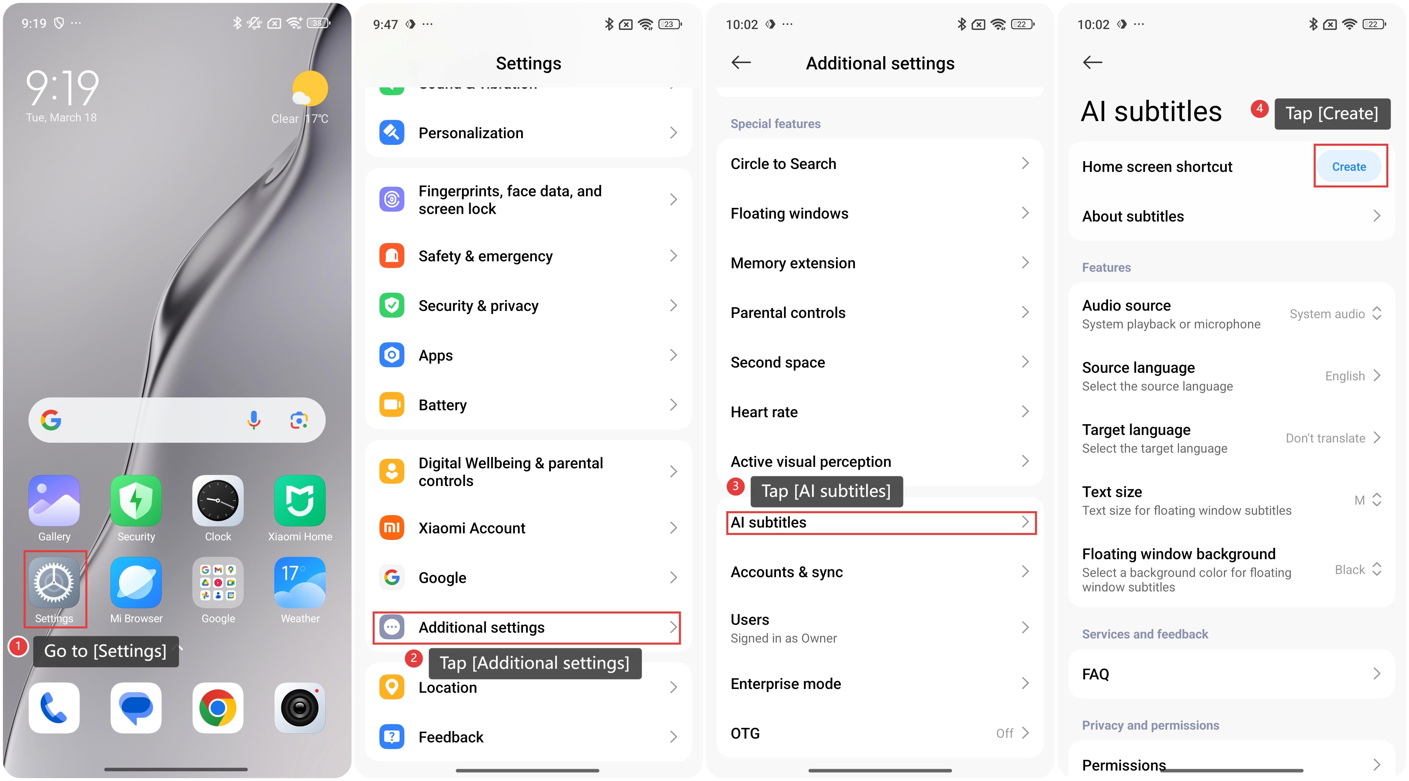 The Xiaomi smartphone supports adding the shortcut of AI subtitles on the home screen, which can make you instantly launch AI subtitles without opening it in the Control center. AI subtitles can transcribe and translate internal and external audio into bilingual subtitles in real time. Great for online meetings, online classes, live videos, hearing accessibility, and more.