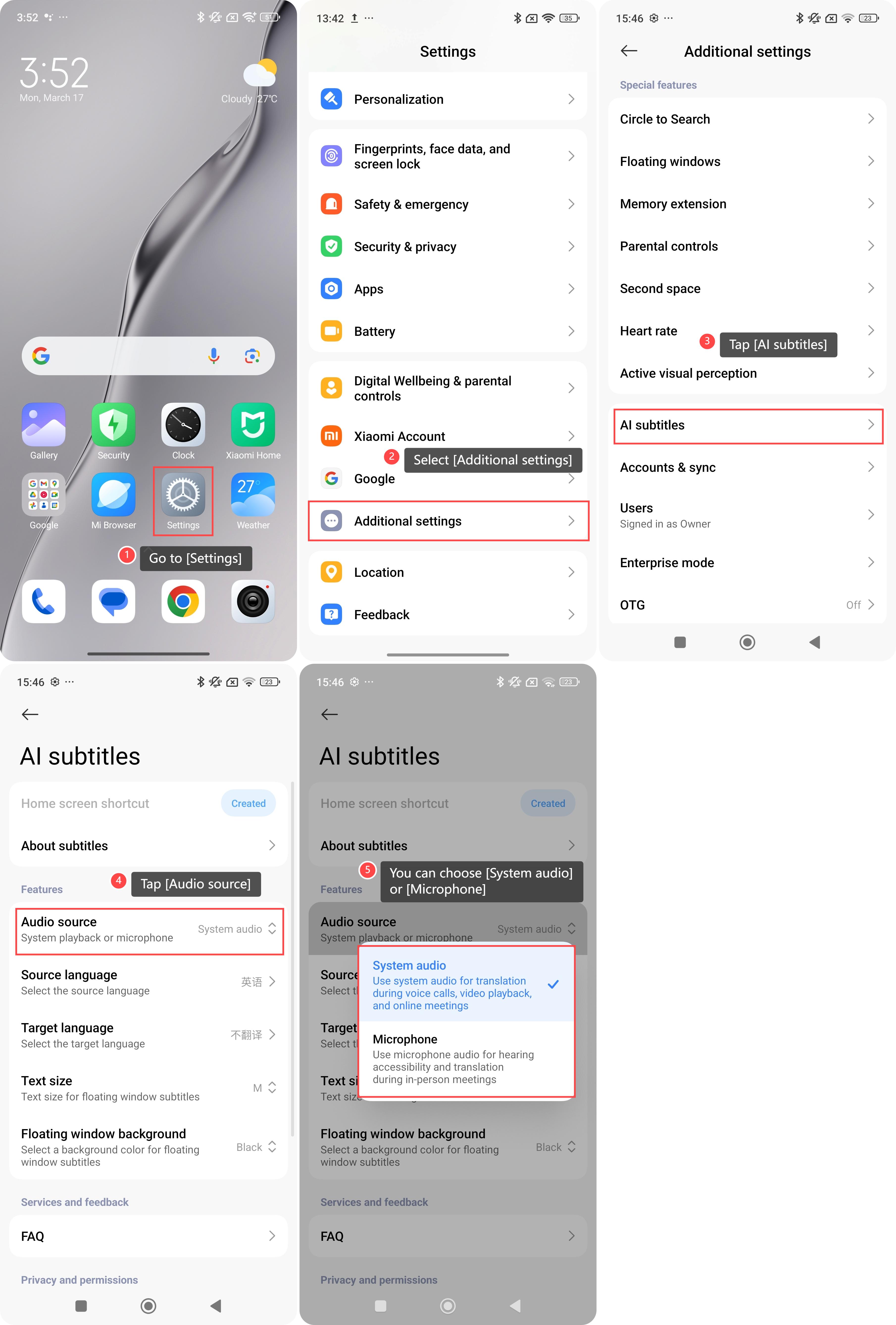 The Xiaomi smartphone supports setting the audio source for AI subtitles translation. You can choose audio source options for optimal performance. You can use System audio for translation during voice calls, video playback, and online meetings.You can also use Microphone audio for hearing accessibility and translation during in-person meetings. Both of these audio sources are designed to cater to different usage scenarios, ensuring the AI subtitles are more accurate. To set the audio source for AI subtitles translation on your phone, please refer to the following methods: Method 1: 1. Go to [Settings]on your phone; 2. Select [Additional settings]; 3. Tap[AI subtitles]; 4. Tap [Audio source]; 5. You can choose [System audio]to use system audio for translation during voice calls, video playback, and online meetings or choose [Microphone] to use microphone audio for hearing accessibility and translation during in-person meetings.