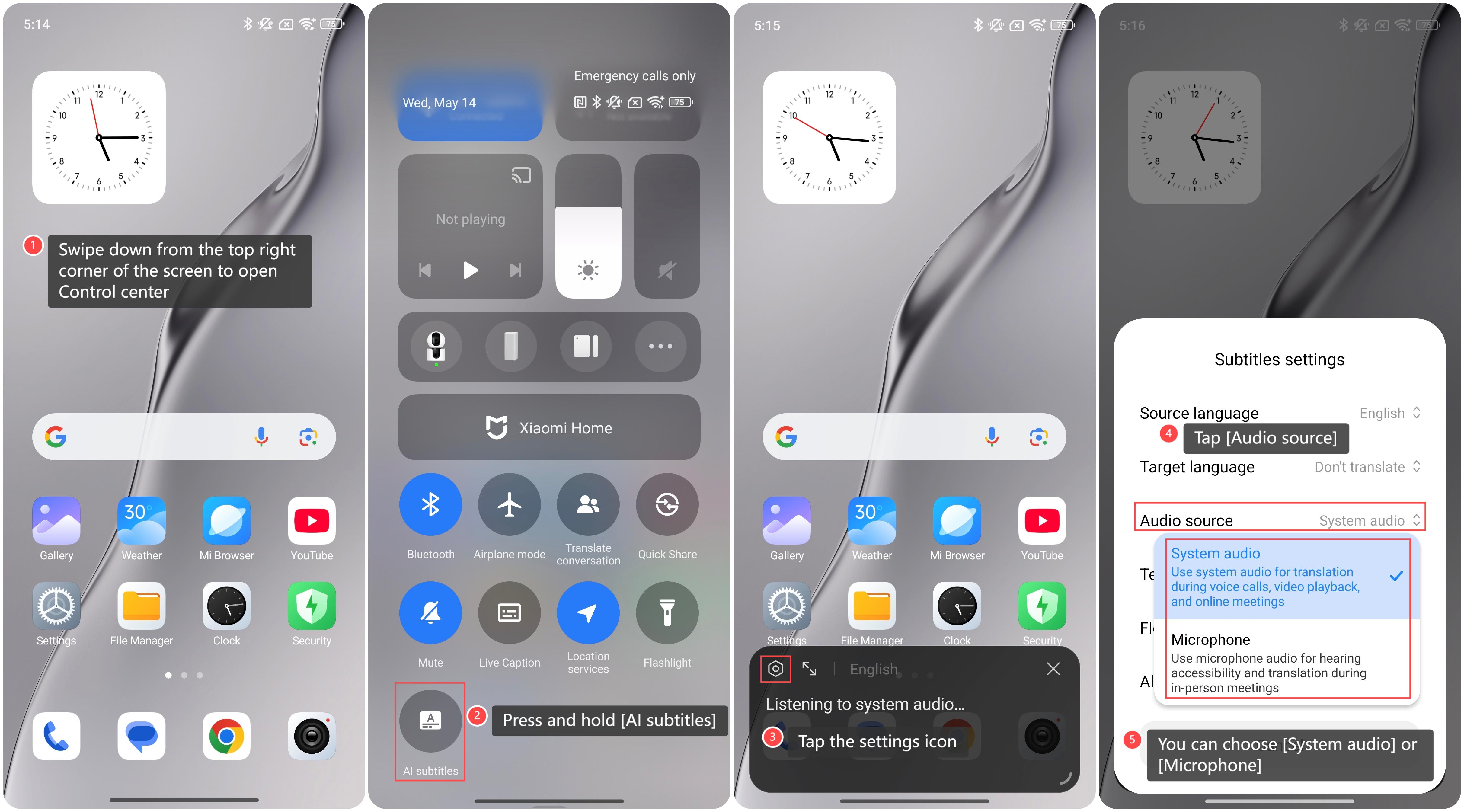 Method 2: 1. Swipe down from the top right corner of the screen to open Control center; 2. Press and hold [AI subtitles]; 3. Tap the settings icon; 4. Tap [Audio source]; 5. You can choose [System audio]to use system audio for translation during voice calls, video playback, and online meetings or choose [Microphone] to use microphone audio for hearing accessibility and translation during in-person meetings.
