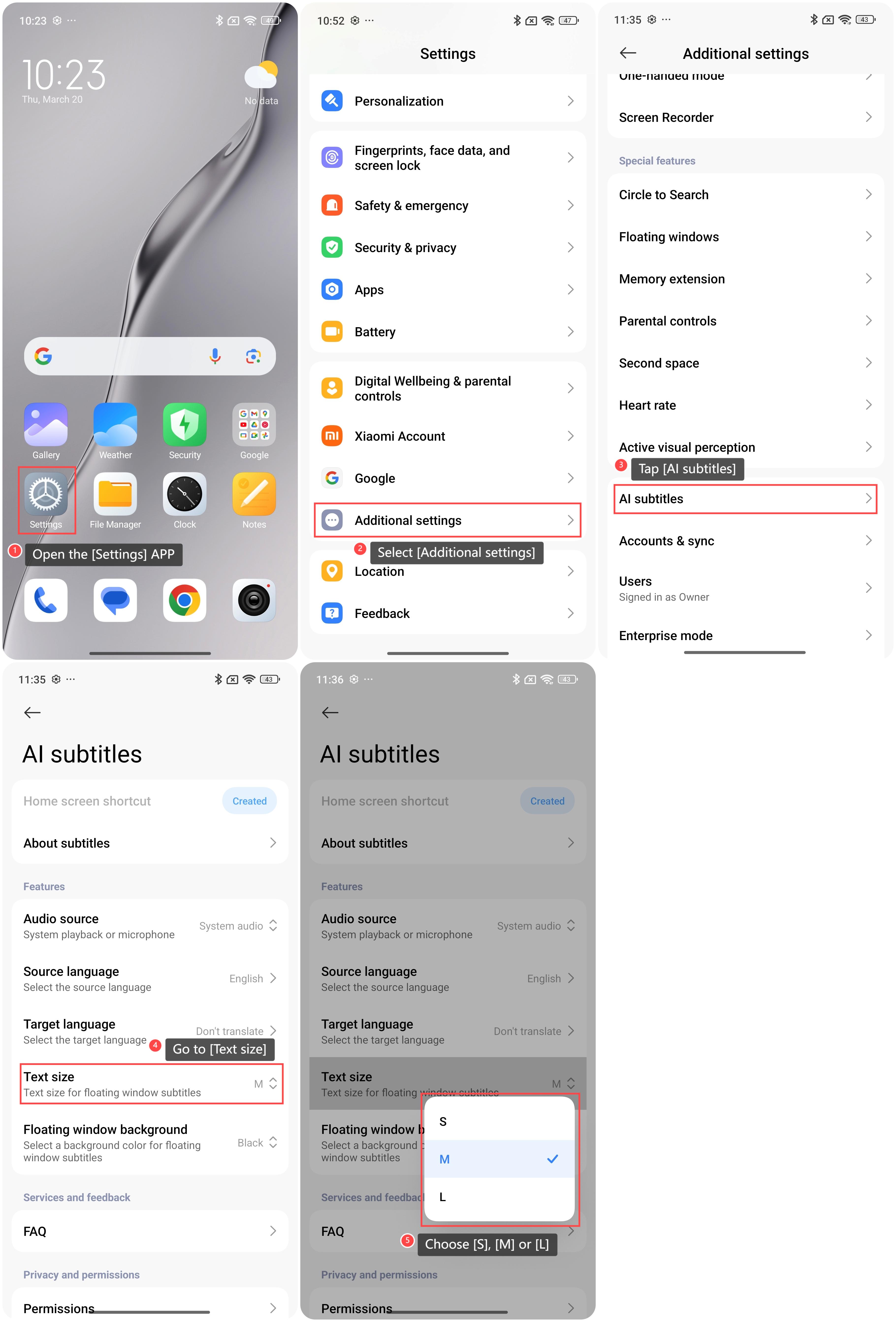To set the text size for AI subtitles on the phone, please refer to the following steps: