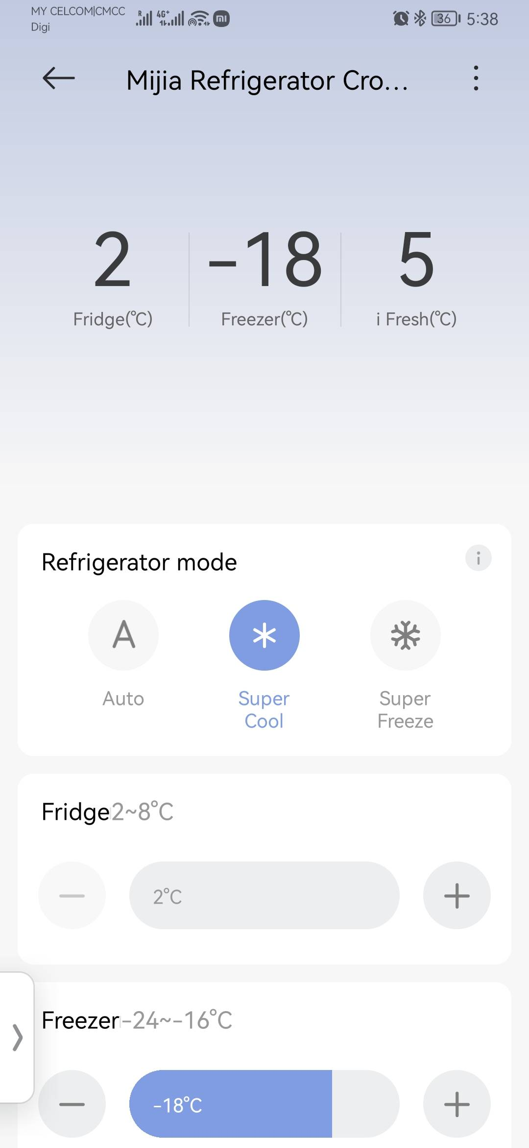 The Mijia Refrigerator Cross Door 510L features Super Cool mode to set the refrigerator temperature to 2°C, which can meet your need when you want to quickly cool food placed in the fridge. To enable the Super Cool mode, you can tap the Mode button icon. You can also tap the refrigerator plug-in in the Mi Home/Xiaomi Home APP, and then select [Super Cool]. The Super Cool mode will exit if any of the following conditions are met: 1. In unlocked state, touch the Mode button to switch to other modes; 2. The default duration of Super Cool mode is 8 hours, and it will automatically turn off after 8 hours; 3. In unlocked state, touch the Fridge button to adjust the set temperature of the refrigerator compartment, and the refrigerator will switch to custom mode.