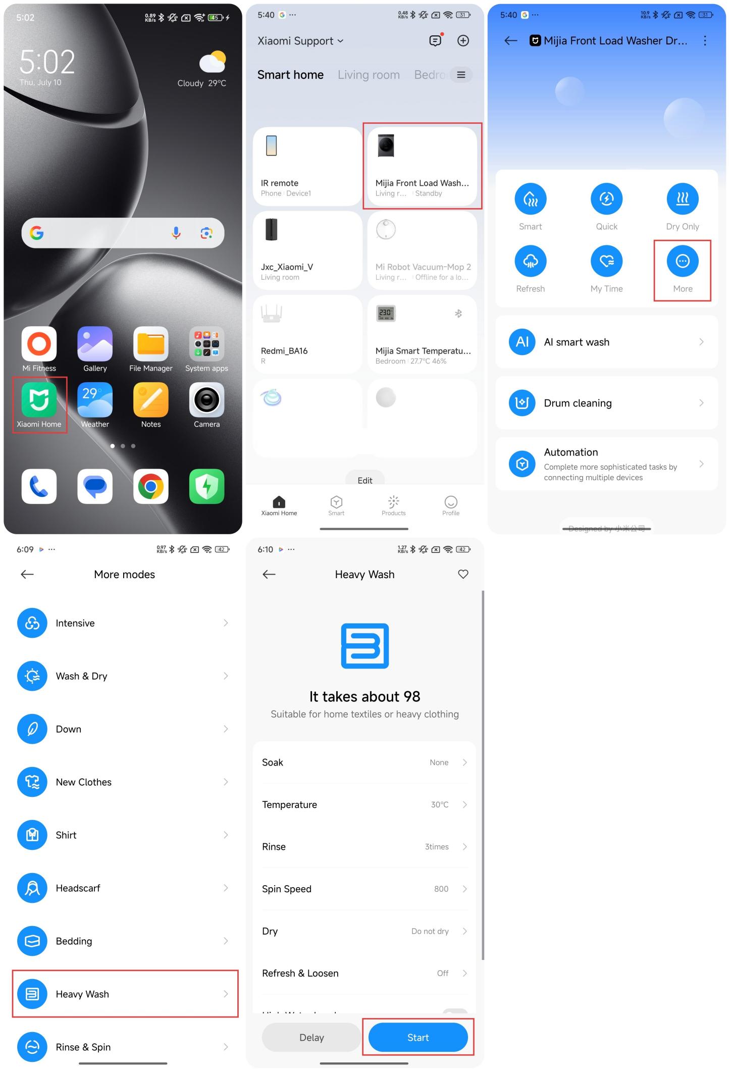 To use the Heavy Wash program on the Mijia Front Load Washer Dryer 10.5kg, please refer to the following steps: 1. Please press and hold the Power button to turn on; 2. Put the clothes into the drum and close the door; 3. Press and hold on [Steam] and [High Temp.] on the panel at the same time to enable remotely control; 4. Open the Mi Home/Xiaomi Home APP; 5. Tap the [Mijia Front Load Washer Dryer 10.5kg]; 6. Tap [More]; 7. Select the [Heavy Wash] program; 8. Tap [Start] to run the Heavy Wash program. Note: The Heavy Wash program is suitable for washing or drying bed linens such as bed covers, sheets, and quilt covers.