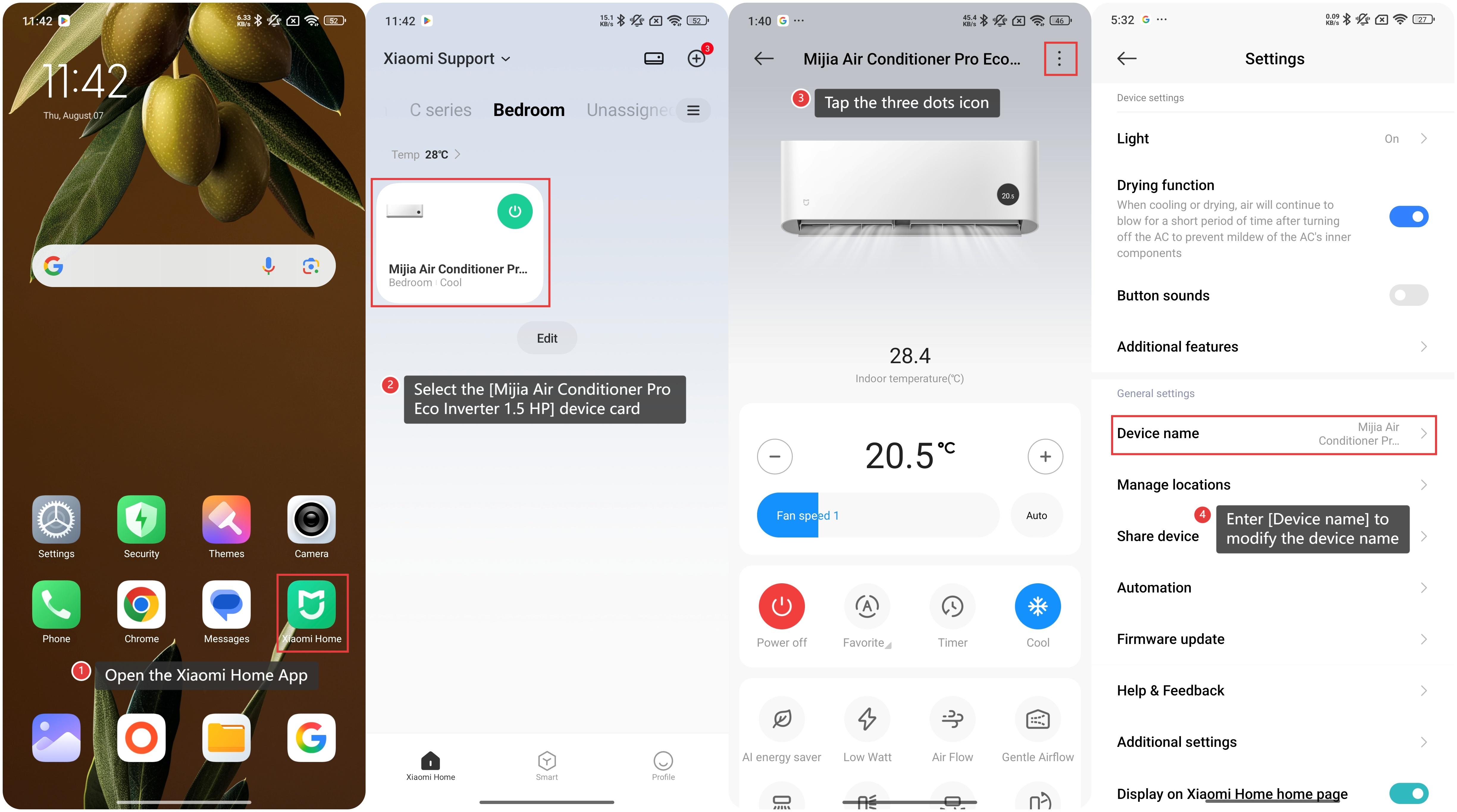 The Mijia Air Conditioner Pro Eco Inverter 1.5 HP supports changing its device name within the Xiaomi Home App, allowing you to personalize and easily identify the device, especially when managing multiple devices. Follow these steps to modify the device name of the Mijia Air Conditioner Pro Eco Inverter 1.5 HP: 1. Open the Xiaomi Home App on your device; 2. Select the [Mijia Air Conditioner Pro Eco Inverter 1.5 HP] device card; 3. Tap the three dots icon at the upper right corner; 4. Enter [Device name] to modify the device name.