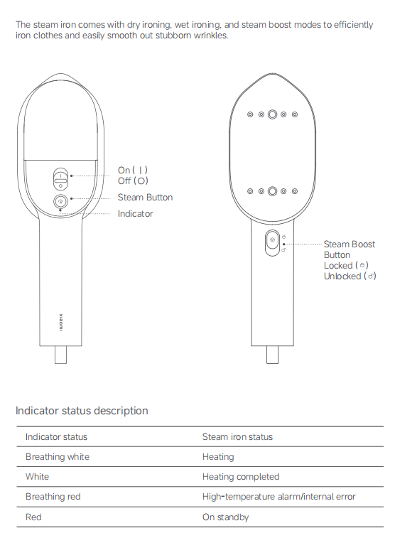 7. Q:What are the functions of the buttons on the Xiaomi Handheld Steam Iron? A: There are On/Off switch, steam button and steam boost button on the Xiaomi Handheld Steam Iron: 1. On/Off Switch: Toggle the On/Off switch from "○" to "I" to turn on the steam iron. Then the steam iron will start heating with its indicator breathing in white.After about 30 seconds, the indicator will remain in white, indicating the steam iron has completed heating. Take the steam iron from the base for use; 2. Steam Button: After the steam iron completes heating, press the steam button to enter the wet ironing mode, and then the steam iron will emit steam continuously for steaming. Press the steam button again to stop emitting steam; 3. Steam Boost Button: Toggle the steam boost button from “Locked”to “Unlocked” to unlock it. Then press the button to emit a burst of steam. When not planning to use the steam boost mode, toggle the steam boost button back to “Locked” to avoid enabling this function accidentally.