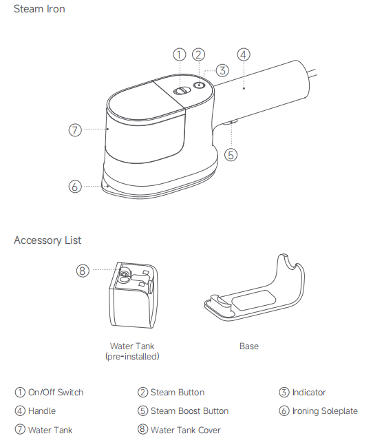 Product Introduction & Use 1. Q: What is the appearance of the Xiaomi Handheld Steam Iron? A: On the Xiaomi Handheld Steam Iron, the On/Off switch and steam button are located on the top near the front of the handle. The indicator, also on the top, displays the operating status. The handle serves as the grip. On the side of the handle is the steam boost button. The ironing soleplate forms the bottom plate of the iron. The water tank cover is positioned on the side of the main body and provides access to the water tank. The water tank is a detachable accessory, allowing for easy refilling.