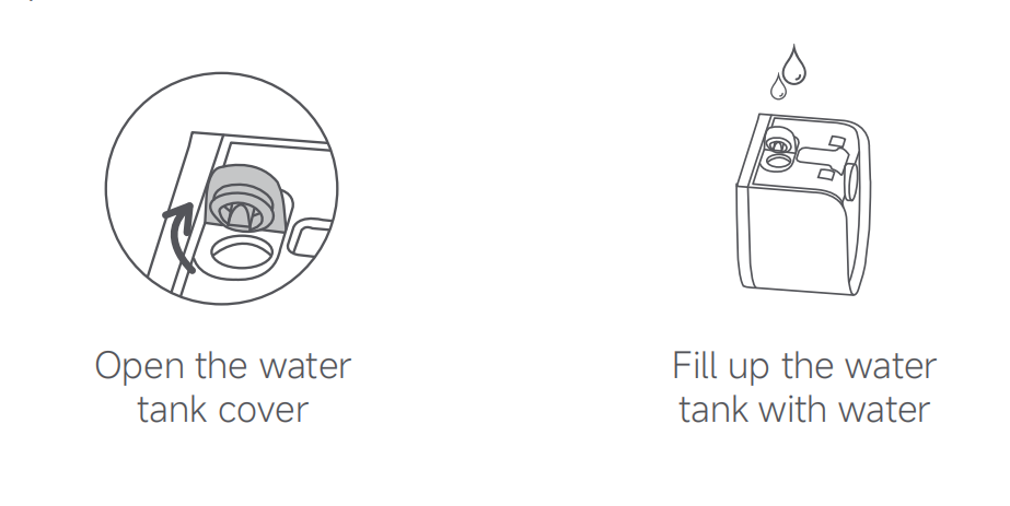 2. Q: How to fill water in the water tank of the Xiaomi Handheld Steam Iron? A: To fill water in the water tank of the Xiaomi Handheld Steam Iron, please refer to the following steps: 1. Removing the water tank. Hold the water tank and pull it up vertically to remove it; 2. Filling the tank with water. Open the water tank cover and add purified water to the tank. After filling, close the water tank cover tightly; 3. Installing the water tank. Hold the water tank against the steam iron, and press it down vertically as illustrated. When you hear a "click", it indicates the tank is securely installed.