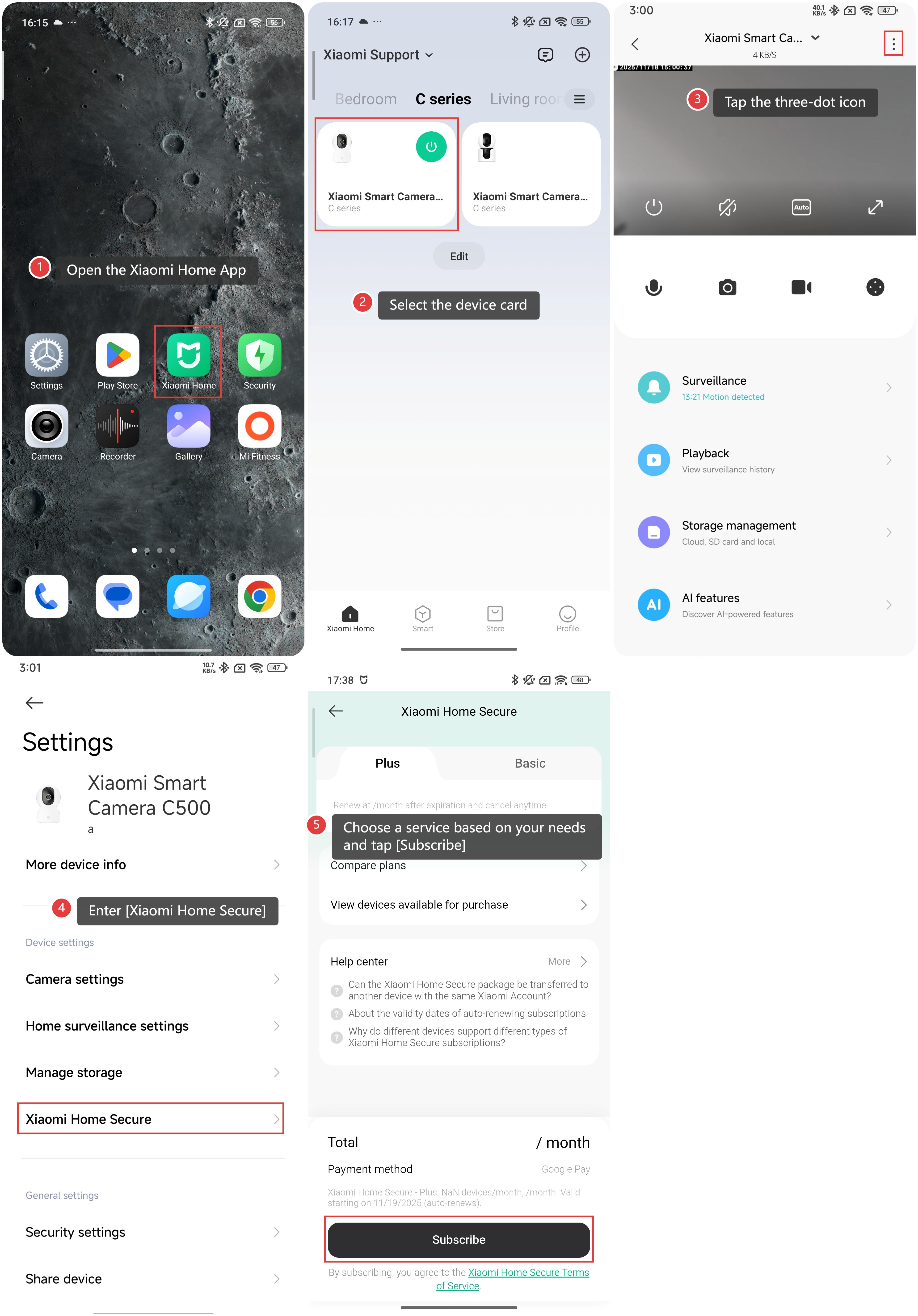 To subscribe to the Xiaomi Home Secure, please refer to the following steps: