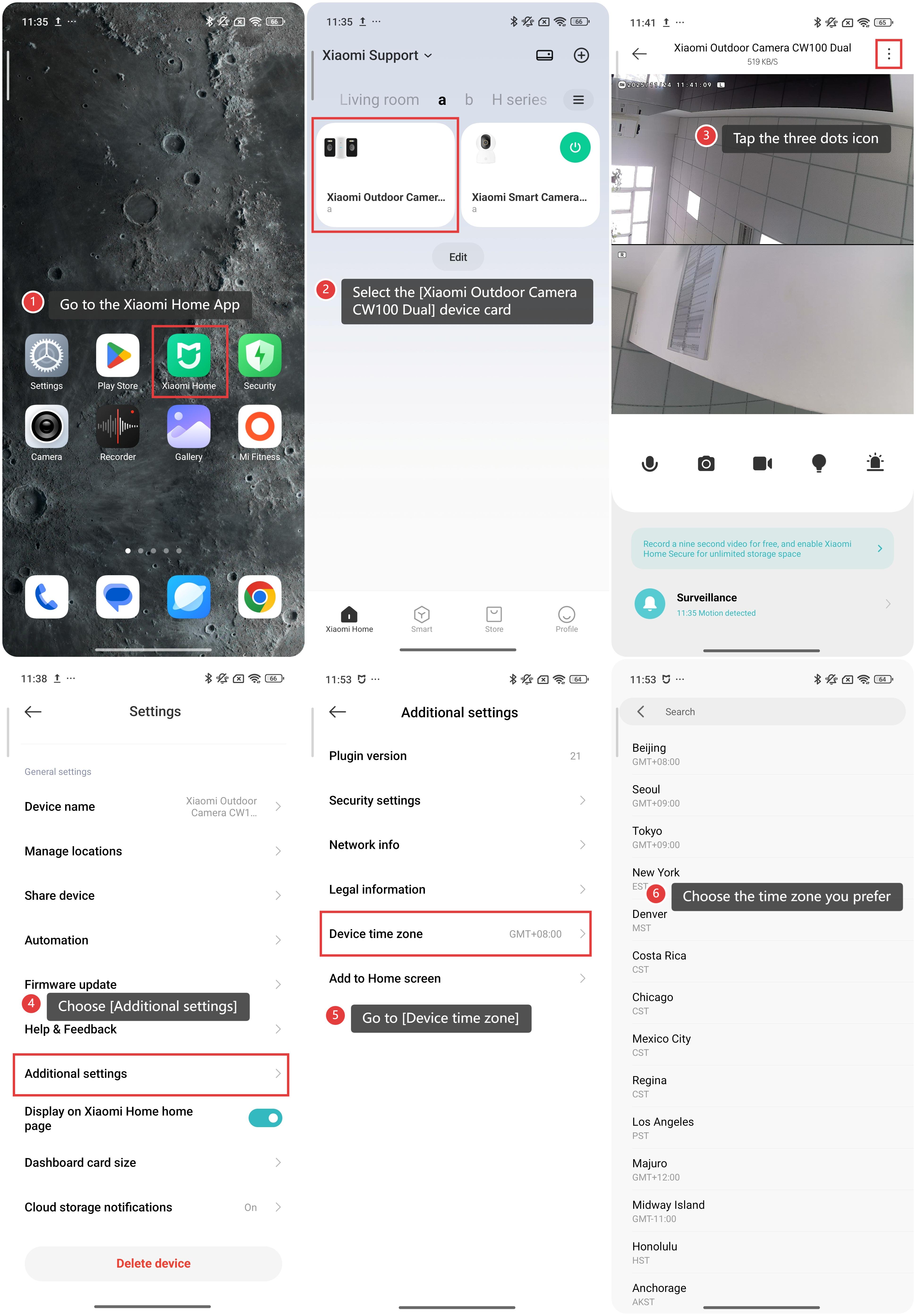 To change the time zone of the Xiaomi Outdoor Camera CW100 Dual, please refer to the following steps: