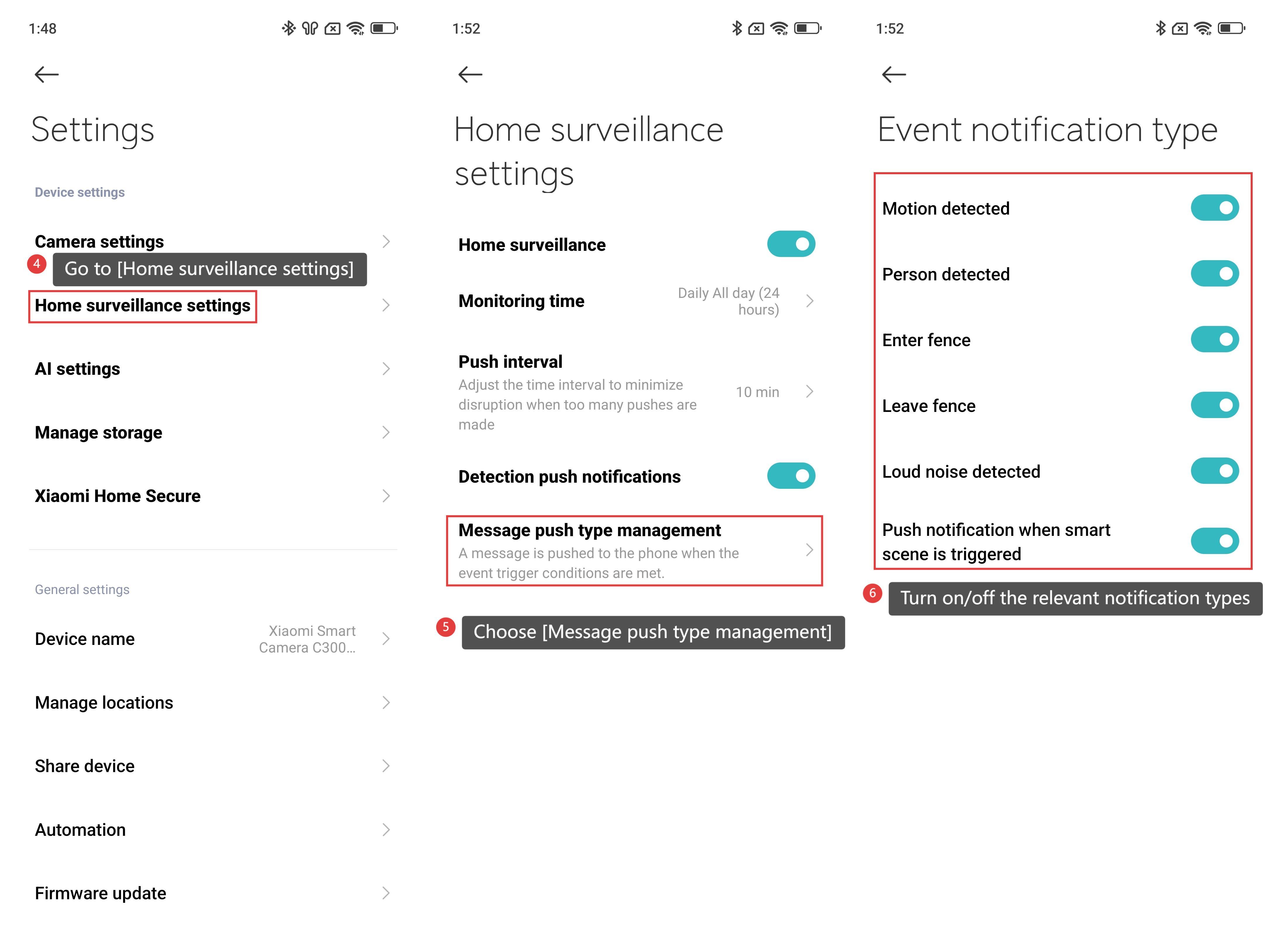 You can turn on/off the [Motion detected], [Person detected], [Enter fence], [Leave fence], [Loud noise detected] and [Push notifications when smart scene is triggered].