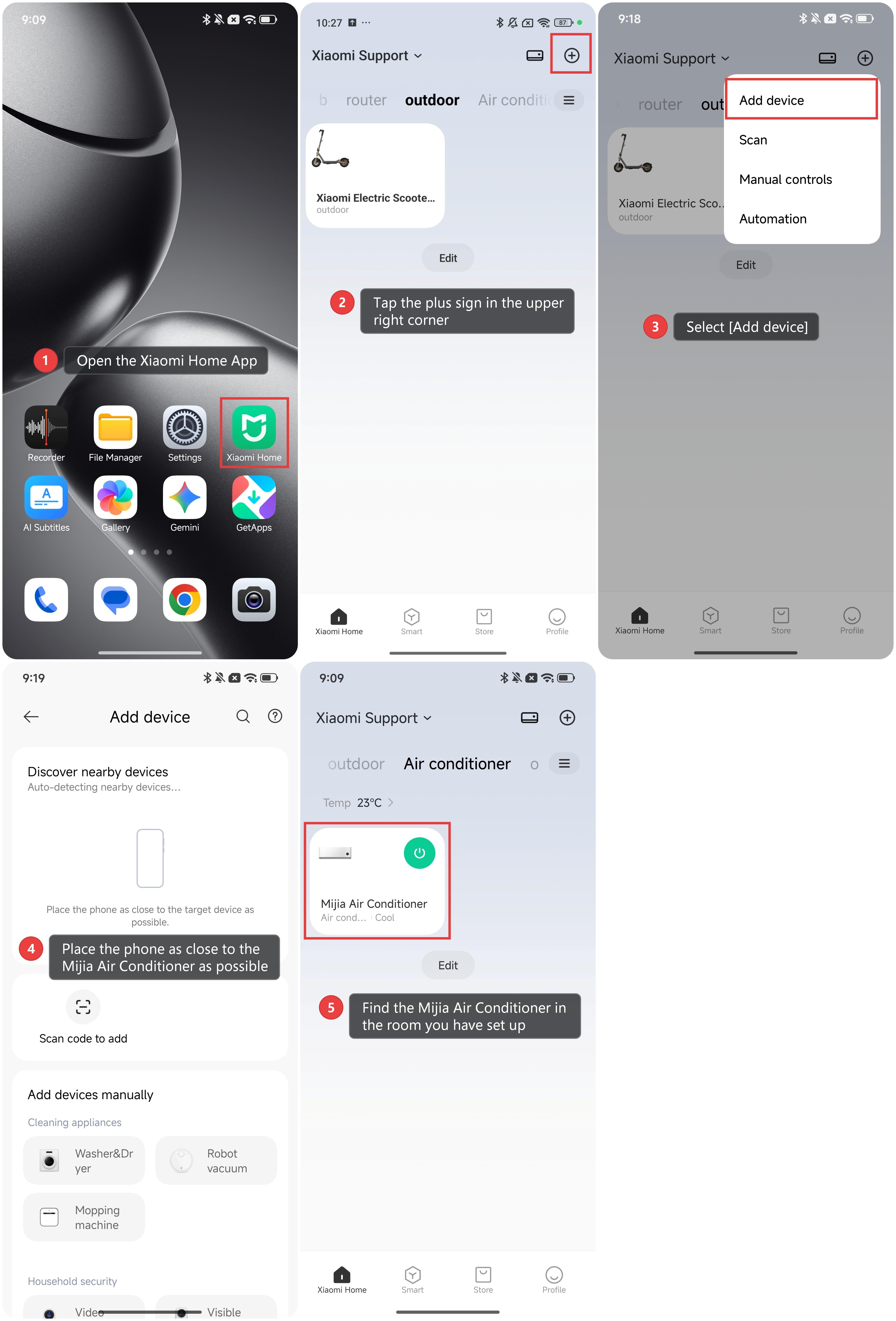 To add the Mijia Air Conditioner to the Xiaomi Home App, follow the steps below:
