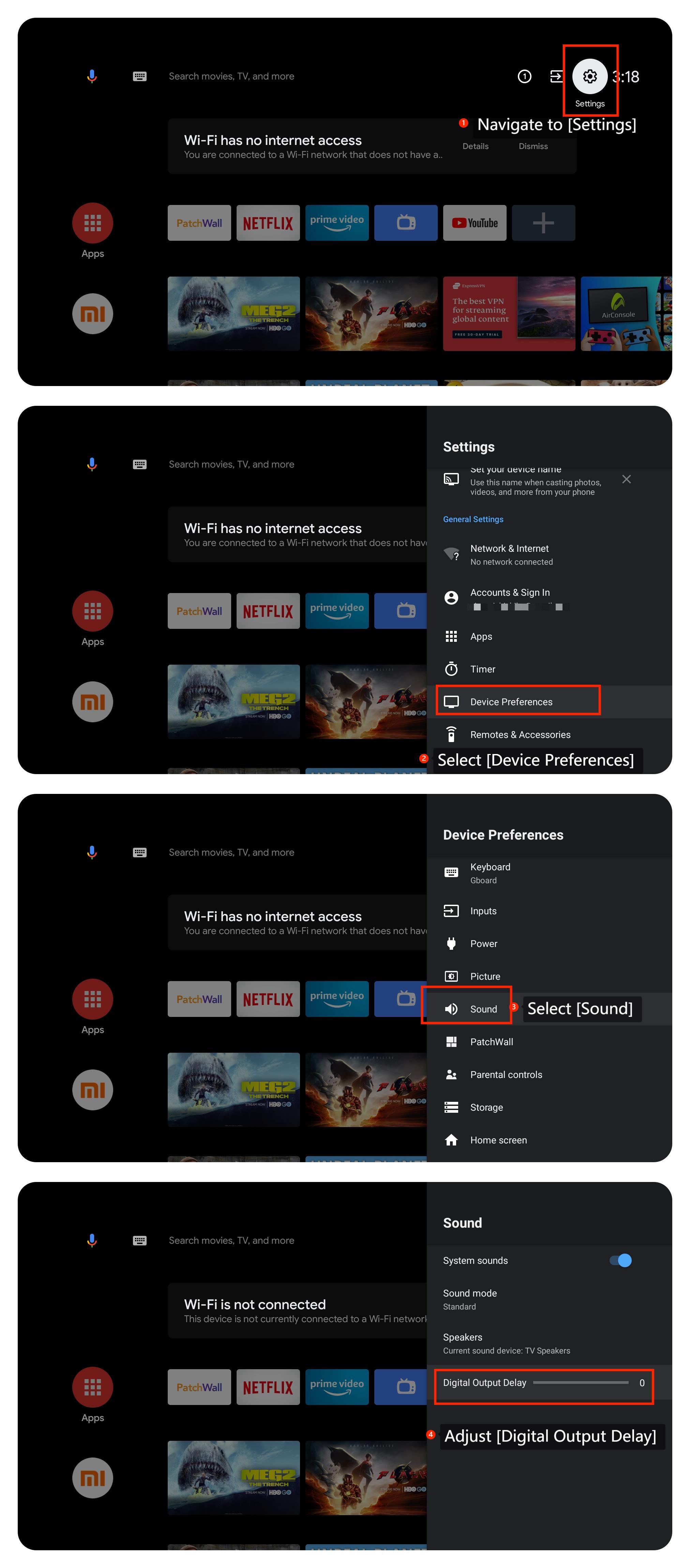 If the issue occurs when you are using external devices like soundbar, please refer to the following methods: 1. Make sure all cables related to your external audio devices are securely plugged in as loose or damaged cables can lead to audio issues; 2. Make sure your external audio devices are functioning correctly; 3. Check if the speaker setting is correct on your TVby navigating to [Settings] >> [Device Preferences] >> [Sound] >> [Speakers] >> [TV Speakers] or [S/PDIF]. Scenario 2: If the issue occurs when you are using the built-in speaker of your TV, please refer to the following methods: 1. An echo can occur if the TV volume is too high. So try reducing the TV's volume to see if the echo diminishes; 2. Check the Audio settings by going to [Settings] >> [Device Preference] >> [Sound] >> [Digital Output Delay]; 3. Try adding rugs, curtains, or other soft furnishings to help reduce sound reflections as hard surfaces or open spaces can lead to the echo; 4. Try playing different types of content such as movies, TV shows, and music to see if the echo is consistent across all sources, which can help determine if the issue is content-specific; 5. You can check for updates by navigating to [Settings] >> [Device Preferences] >> [About] >> [System update]; 6. If the problem persists, you can perform a factory reset by navigating to [Settings]>> [Device Preferences] >>[Reset]. Be aware that this will erase all data and settings on your TV, so make sure to back up anything important before doing this. If the above troubleshooting methods can’t resolve the issue, please contact our local official service center or your seller for further assistance. They will help you in this regard.