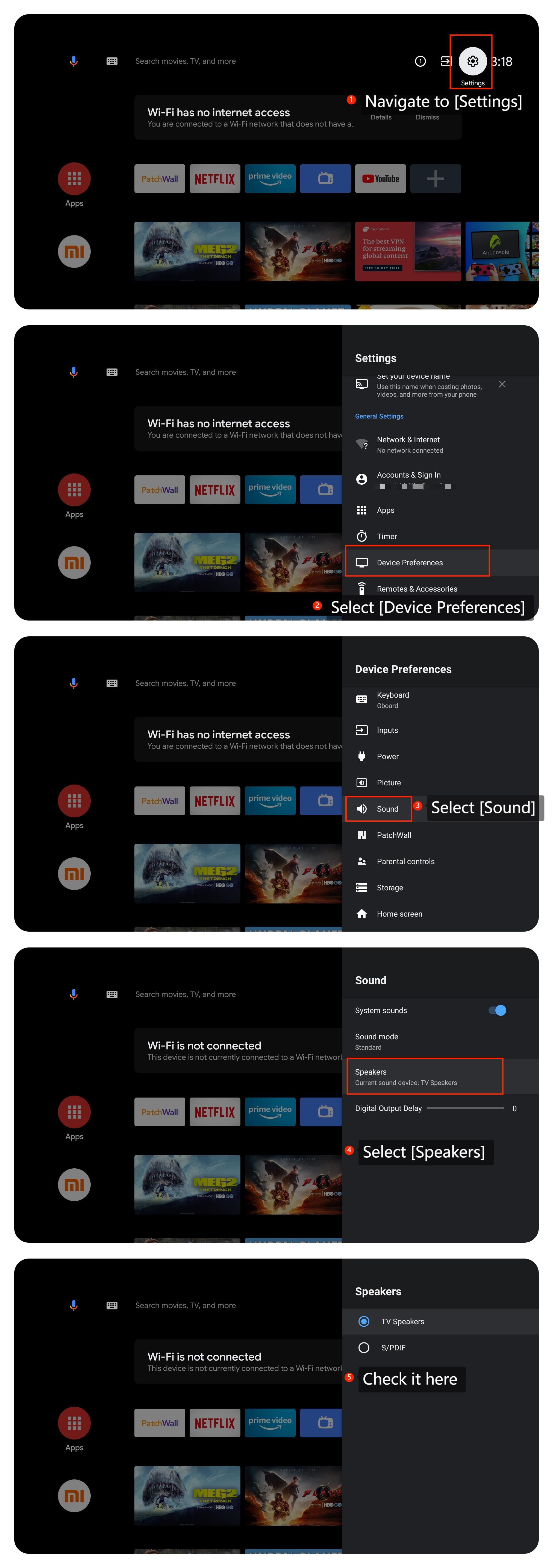 When encountering sound distortion or noise problems on your Xiaomi TV A2 32, you can try the following troubleshooting steps to resolve the issue: Scenario 1: If the issue occurs when you are using apps on your TV, please refer to the following methods: 1. Some apps have their own audio settings. Check if the app you’re using has any specific settings for adjusting sound; 2. Ensure that the output is correctly set by going to [Settings] >> [Device Preferences] >> [Sound] >> [Speakers] >> [TV Speakers] or [S/PDIF]; 3. Turn off the TV, unplug it from power, wait for a minute, and then plug it back in and turn it on; 4.Make sure that your TV's system is the latest version by going to[Settings] >> [About] >> [System Update]. If available, install the updates; 5. If the problem persists, you can perform a factory reset by navigating to [Settings]>> [Device Preferences] >>[Reset]. Be aware that this will erase all data and settings on your TV, so make sure to back up anything important before doing this.