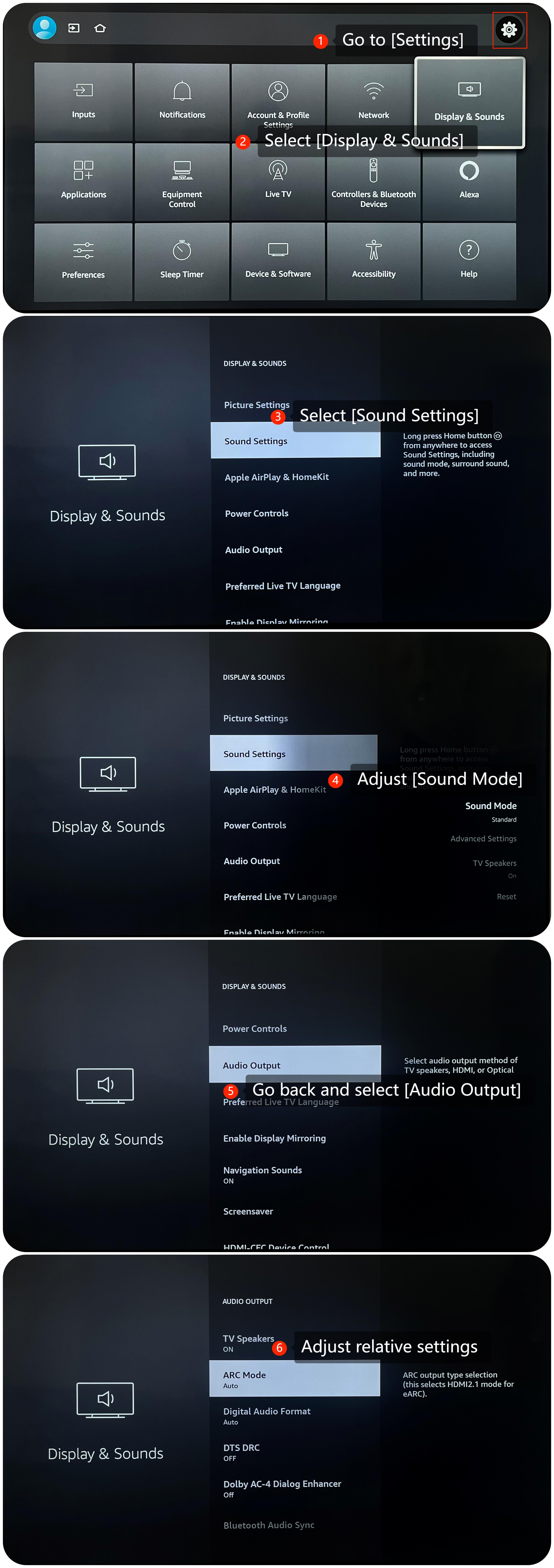 If your Xiaomi TV F2 55’s sound is interrupted, please refer to the following scenarios and troubleshooting methods: Scenario 1: If the issue occurs when you are using apps on your TV, please refer to the following methods: 1. Test different sources (such as a different channel, or streaming service) to check if the issue is specific to a particular source or content; 2. You can check and adjust sound settingsby going to [Settings] >> [Display & Sounds] >>[Sound settings] >> adjust [Sound Mode]. If the issue persists, you can also select [Reset] to reset the sound settings. Additionally, you can go back and select [Audio Output] to adjust relative settings; 3. Please try clearing the app cache and data by going to [Settings] >>[Applications]>> [Manage Installed Applications]>>select the specific app >> [Clear cache]; 4. Ensure that the apps you are using are up to date. Sometimes, app updates can fix the sound issues; 5. If the issue persists, try uninstalling the app and then reinstalling it; 6.Make sure that your TV's operating system is up-to-date, which often includes bug fixes and improvements. Go to [Settings] >> [Device & Software] >> [About] >> [Check for Updates]; 7. As a last resort, you can try performing a factory reset on your TV. Be aware that this will erase all your settings and data, so make sure to back up any important data before proceeding. Navigate to [Settings] >>[Device & Software]>> [Reset to Factory Defaults].
