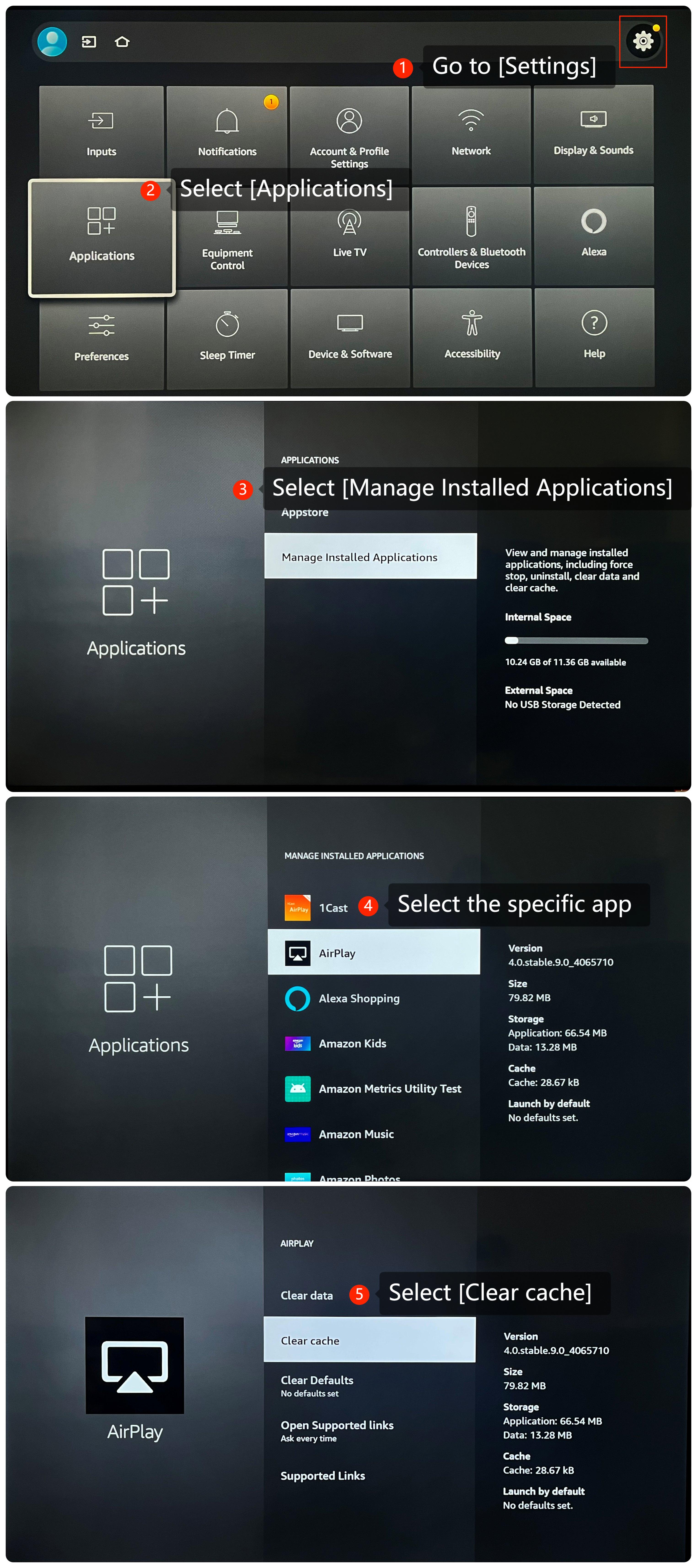 If your Xiaomi TV F2 50’s sound is interrupted, please refer to the following scenarios and troubleshooting methods: Scenario 1: If the issue occurs when you are using apps on your TV, please refer to the following methods: 1. Test different sources (such as a different channel, or streaming service) to check if the issue is specific to a particular source or content; 2. You can check and adjust sound settingsby going to [Settings] >> [Display & Sounds] >>[Sound settings] >> adjust [Sound Mode]. If the issue persists, you can also select [Reset] to reset the sound settings. Additionally, you can go back and select [Audio Output] to adjust relative settings; 3. Please try clearing the app cache and data by going to [Settings] >>[Applications]>> [Manage Installed Applications]>>select the specific app >> [Clear cache]; 4. Ensure that the apps you are using are up to date. Sometimes, app updates can fix the sound issues; 5. If the issue persists, try uninstalling the app and then reinstalling it; 6.Make sure that your TV's operating system is up-to-date, which often includes bug fixes and improvements. Go to [Settings] >> [Device & Software] >> [About] >> [Check for Updates]; 7. As a last resort, you can try performing a factory reset on your TV. Be aware that this will erase all your settings and data, so make sure to back up any important data before proceeding. Navigate to [Settings] >>[Device & Software]>> [Reset to Factory Defaults].