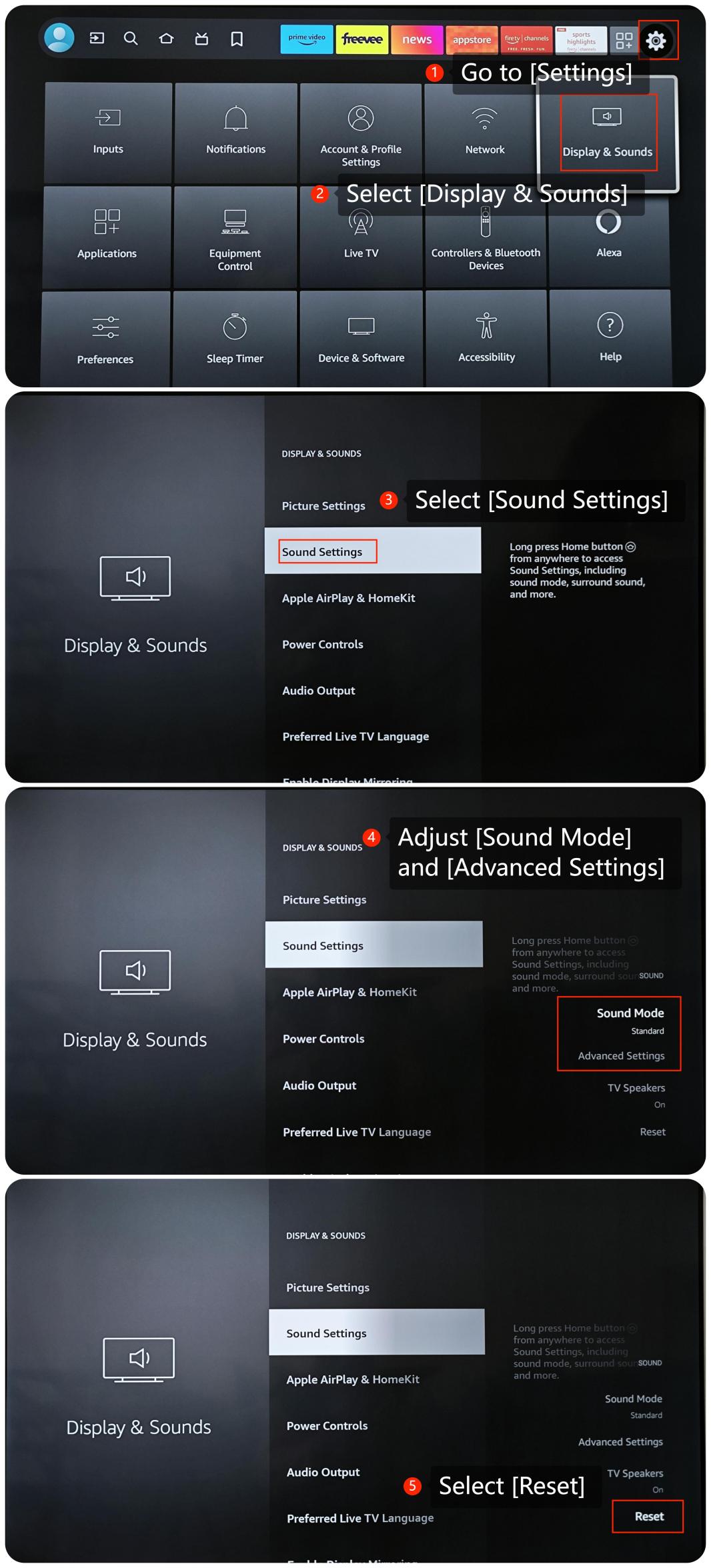 If the sound on your Xiaomi TV F2 43changes dramatically, please refer to the following scenarios and their troubleshooting methods: Scenarios 1: If the issue occurs when you are using apps on your TV, please refer to the following methods: 1. Some apps have their own audio settings. Check if the app you’re using has any specific settings for adjusting sound; 2. You can check and adjust sound settings by going to [Settings] >> [Display & Sounds] >> [Sound settings] >> adjust [Sound mode] and [Advanced settings]. If the issue persists, you can also select [Reset] to reset the sound settings; 3. Make sure that your TV's system is the latest version by going to [Settings] >> [Device & Software] >> [About] >> [Install Update]; 4.As a last resort, consider performing a factory reset on your TV: go to [Settings] >>[Device & Software] >>[Reset to Factory Defaults]. Be aware that this will erase all your settings and data, so make sure to back up any important data before proceeding.