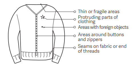 Α: Για να αποφύγετε την καταστροφή των ρούχων σας όταν χρησιμοποιείτε το Mijia Lint Remover 2, να είστε προσεκτικοί όταν το χρησιμοποιείτε στις ακόλουθες περιοχές: