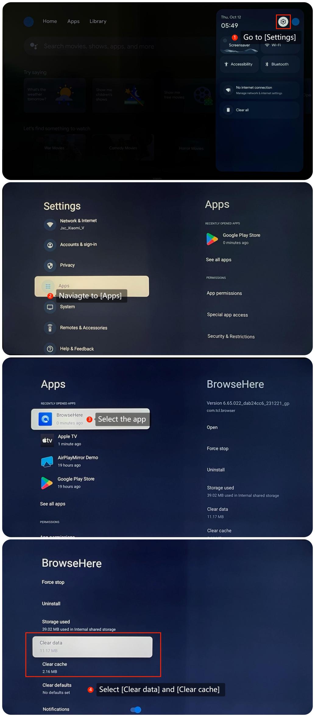 關閉小米電視盒 S(第 2 代)、電視、路由器和數據機,然後將它們從電源上拔下。等待幾分鐘,然後插入電源並打開。