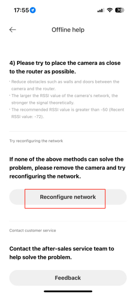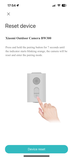 5. 嘗試將相機重新連接到網路。您需要按住電源鍵7秒以上,聽到“重置成功”后再開始下一步,重置成功后按照APP提示的綁定流程操作。