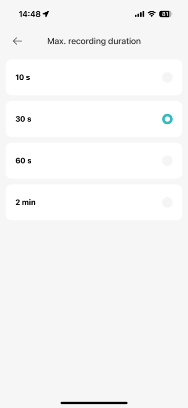 答:目前設備支援 10 秒、30 秒、60 秒和 2 分鐘的視頻錄製。