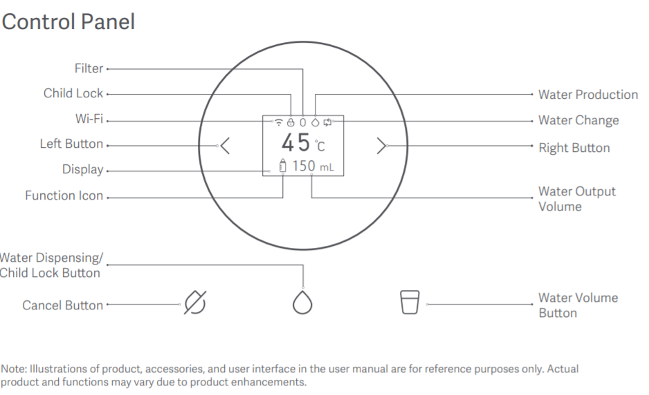 :按1秒解鎖,長按5秒取消兒童鎖。按住兒童鎖定按鈕 5 秒鐘可解鎖兒童鎖定功能。然後,按住它 1 秒鐘控制水,它允許您確認功能表選項並訪問功能表的下一級;