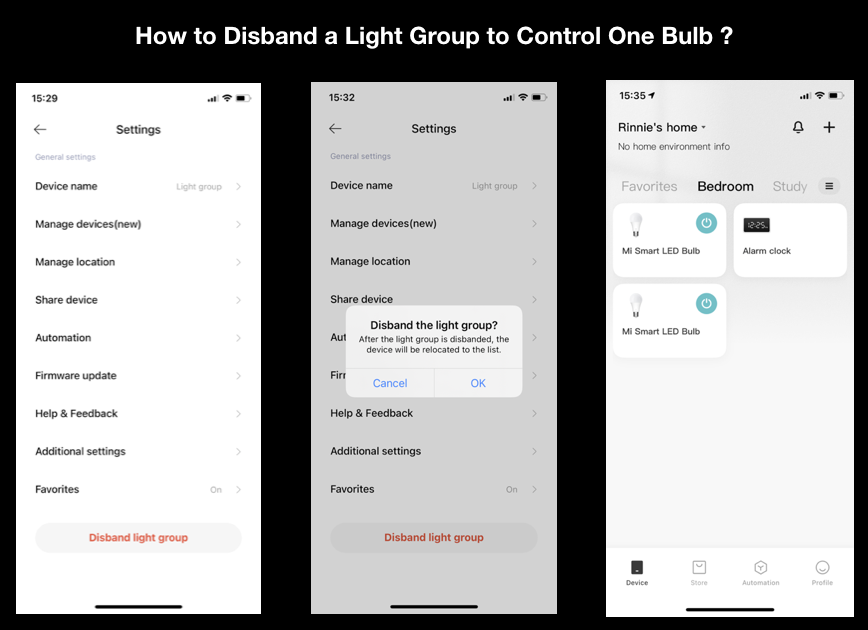 3.如需單獨控制此燈泡,請進入燈組控制頁面,點擊右上角的三點圖示,選擇Disband燈組,設備清單可以恢復單個燈泡設備,點擊進入單燈頁面。