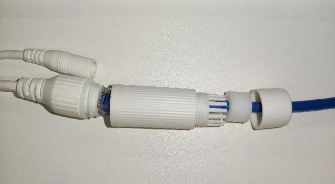 將防水後蓋、擋塊、防水套管依次套在網線上(圖 E-2),再將網線插入介面。