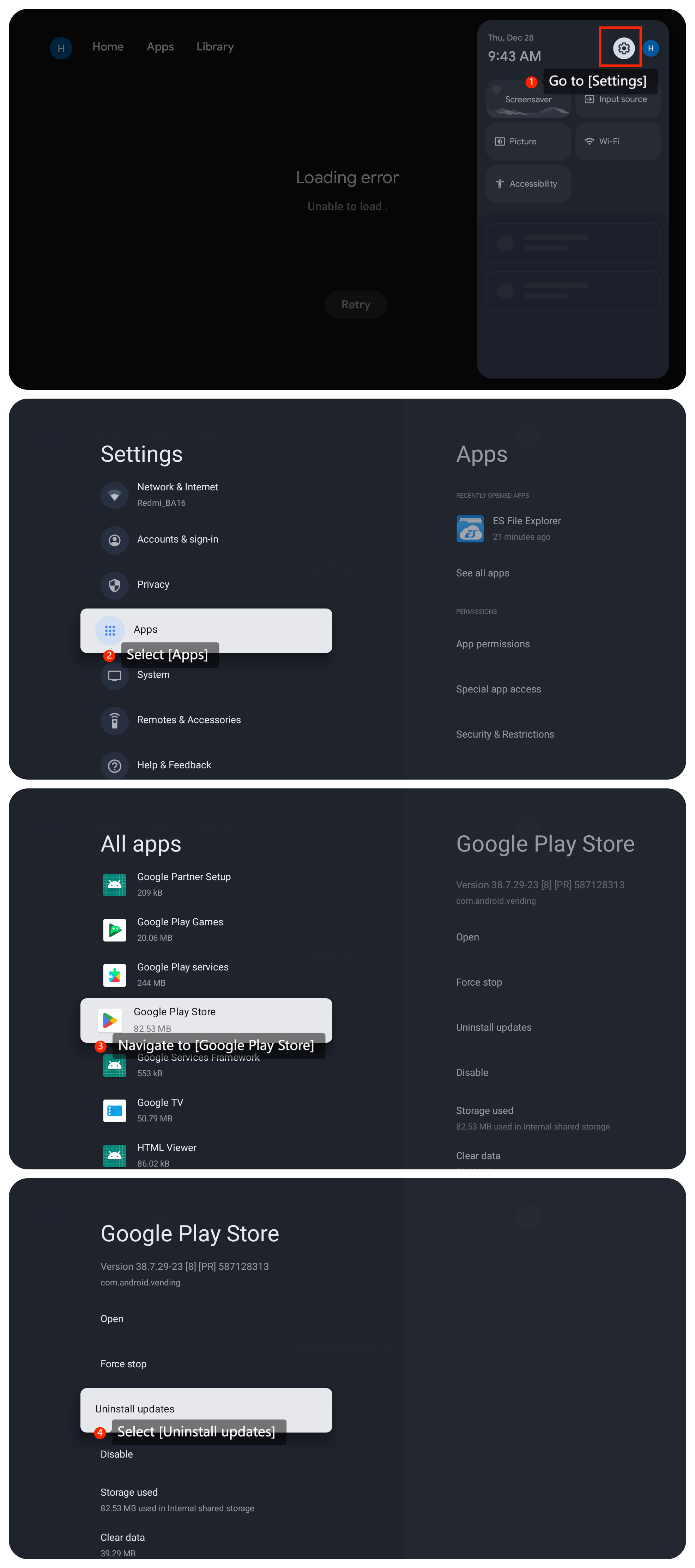 4. 確保您的 Google Play 商店應用程式是最新的。導航到 [設置] >> [應用程式] >> [Google Play 商店] >> [卸載更新];